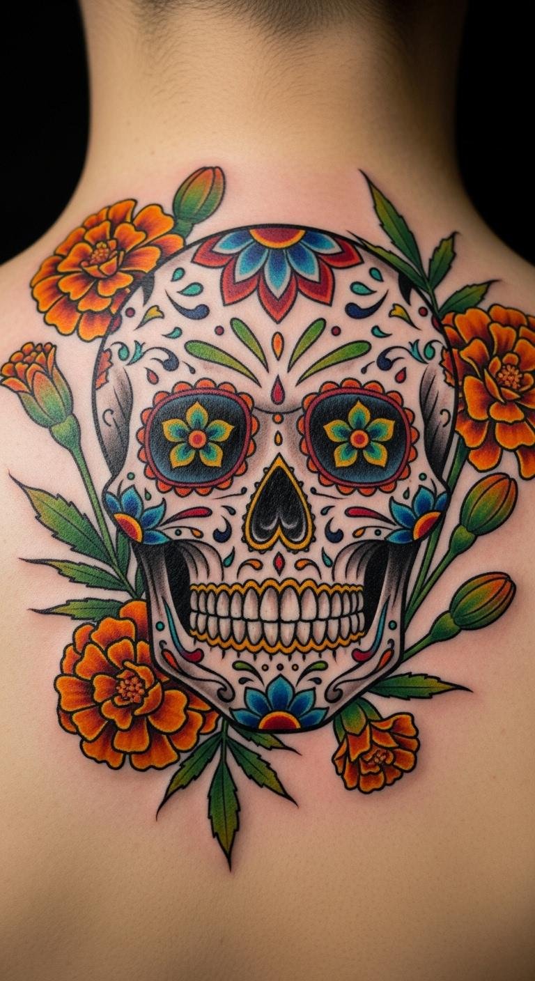 Marigolds on a sugar skull honor traditions. Neck placement makes it bold. Trace cultural designs on fabric. Look for community event inspirations. Choose cultural colors for meaning. This spot draws eyes easily. Use scarves to simulate first. Marigolds brighten the skull’s festive look. Keep it symbolic for depth.