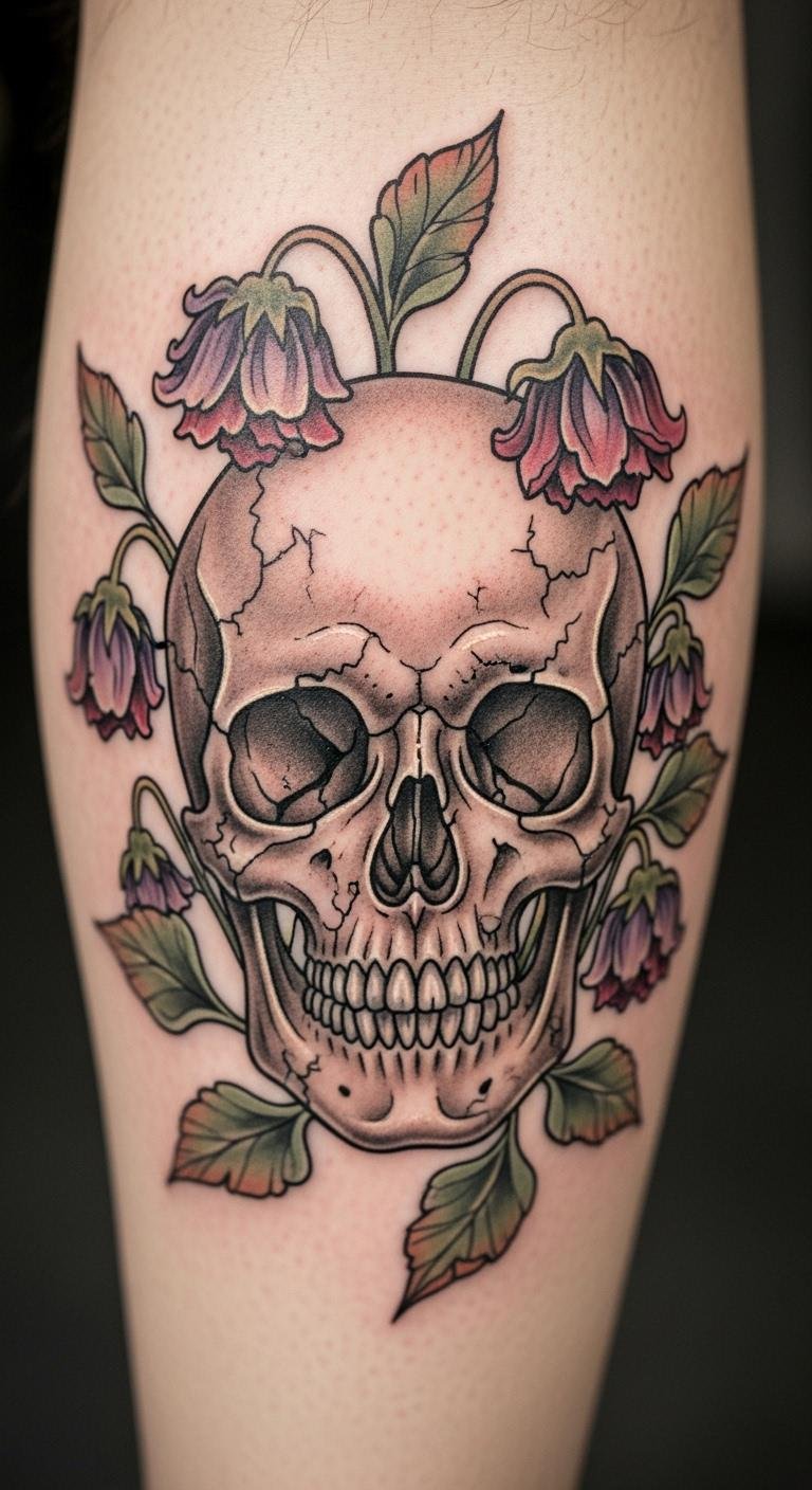 Wilting flowers with a skull show time’s pass. Calf space allows for storytelling. Draw fading petals on paper. Find nature-inspired free art. Use earthy tones for realism. Place it where it flexes with you. Treat with daily washes. Flowers droop to match the skull. Sketch on legs with markers.
