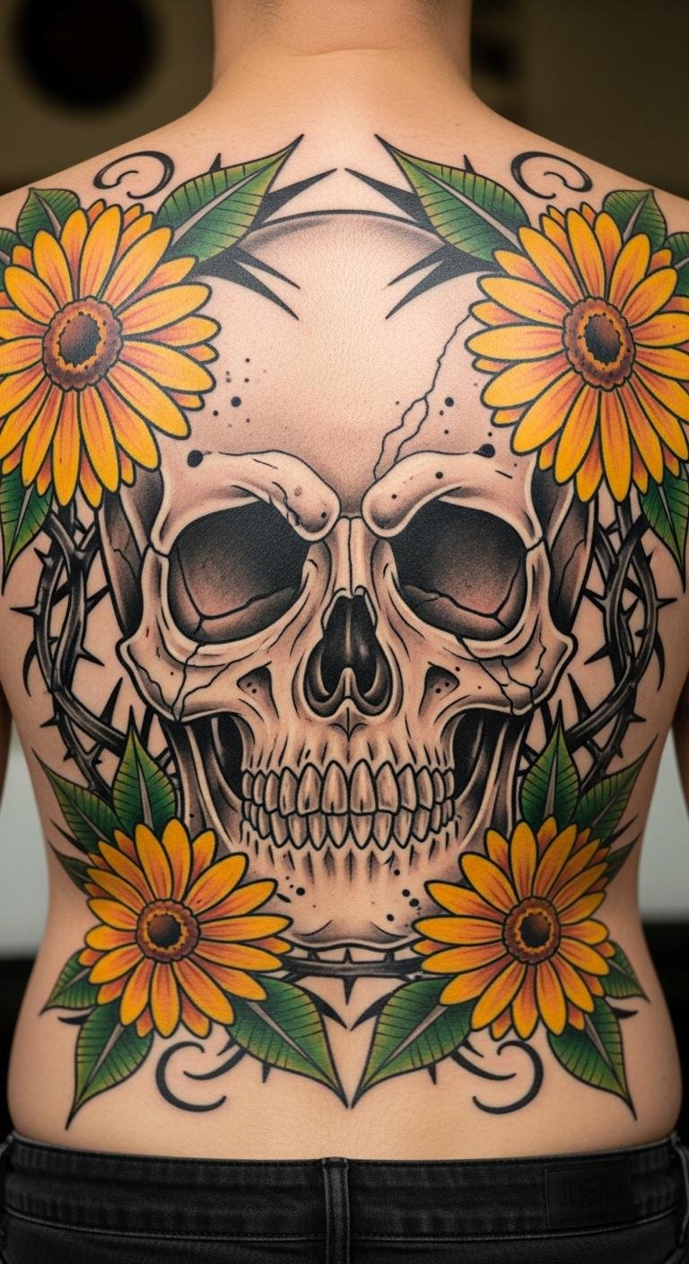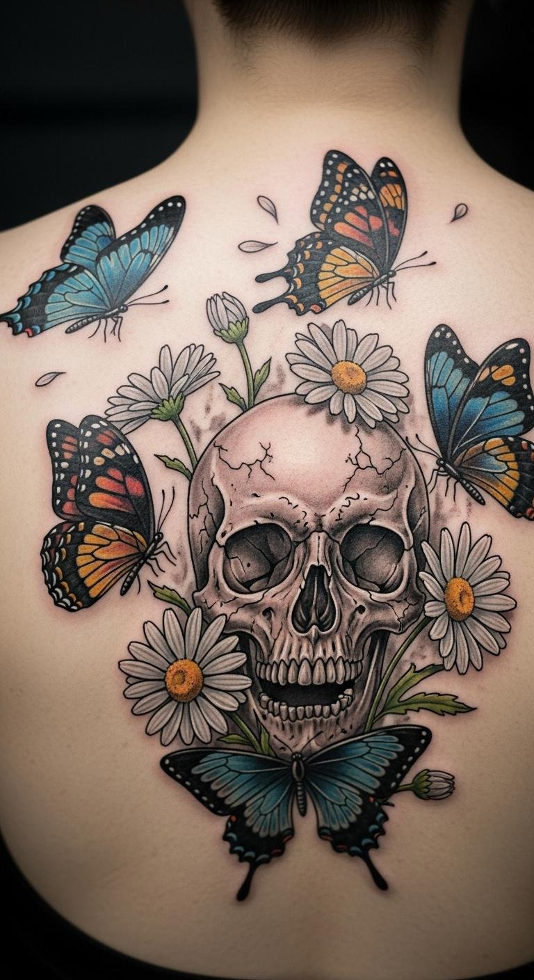 Daisies with a skull add fun contrast. Bold lines make it pop on your back. Sketch ideas on plain paper with pencils. Look for free design sites to copy. Opt for basic colors to save money. This design fits big spaces like your back. Add small dots for extra flair at no extra cost. Use over-the-counter lotions for aftercare. Place it where clothes hide it first. Daisies bring light to the skull’s dark side. Book a quick session for just the outline. Practice drawing flowers on scrap paper. Keep it symmetrical for a clean look. This helps you plan without pressure.