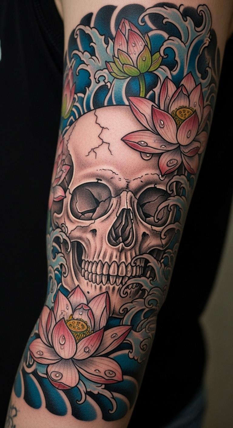 Lotuses and waves with a skull evoke water. Arm placement keeps it viewable. Blend in wave sketches at home. Find oceanic free designs. Use blue washes for effect. This flows with your movements. Cool with water sprays. Waves cradle the skull and flowers.