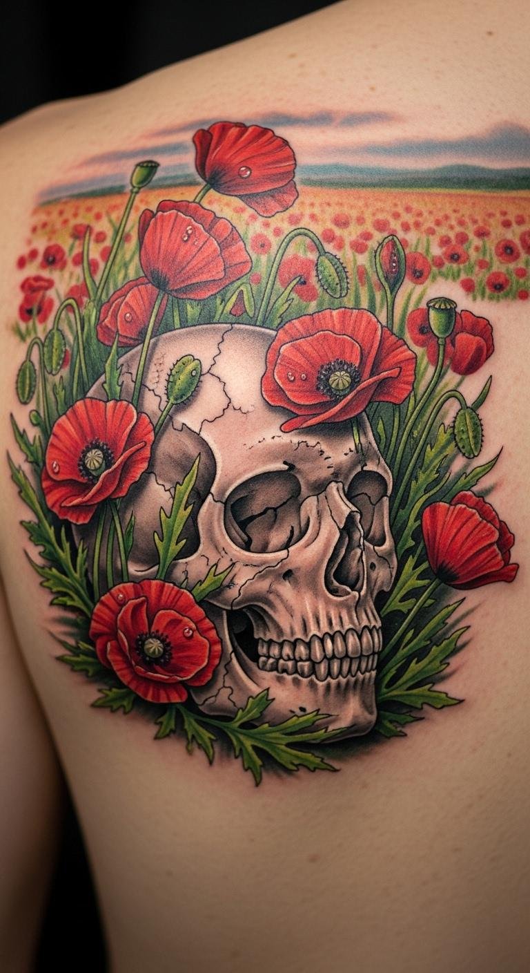 Poppies and a skull in minimal style fit wrists. Less detail means quicker, cheaper work. Sketch with a single pen on your hand. Find simple ideas on free art platforms. Stick to black ink for easy upkeep. This design stays hidden under sleeves. Use ice from your freezer for comfort. Poppies nod to memory near the skull. Draw on temporary tattoos first. This tests the look at no cost. Keep it small for a fast session. Focus on straight lines for neatness.