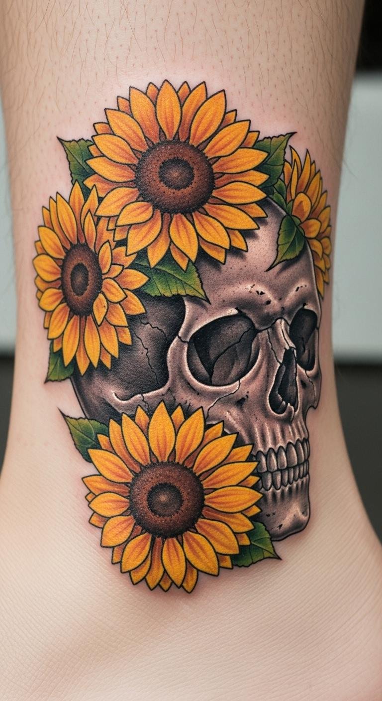 Sunflowers around a skull brighten things up. This spot on your ankle keeps it discreet. Draw sunflowers on notebooks to experiment. Search for free stencil downloads online. Choose yellow shades that won’t fade fast. Add seeds as details using cheap markers. Place it low for easy daily wear. Use household aloe for soothing effects. Sunflowers symbolize hope against the skull’s theme. Get a friend to help with initial sketches. This makes planning a group activity. Keep the size small to reduce costs. Focus on clean lines for a polished result.