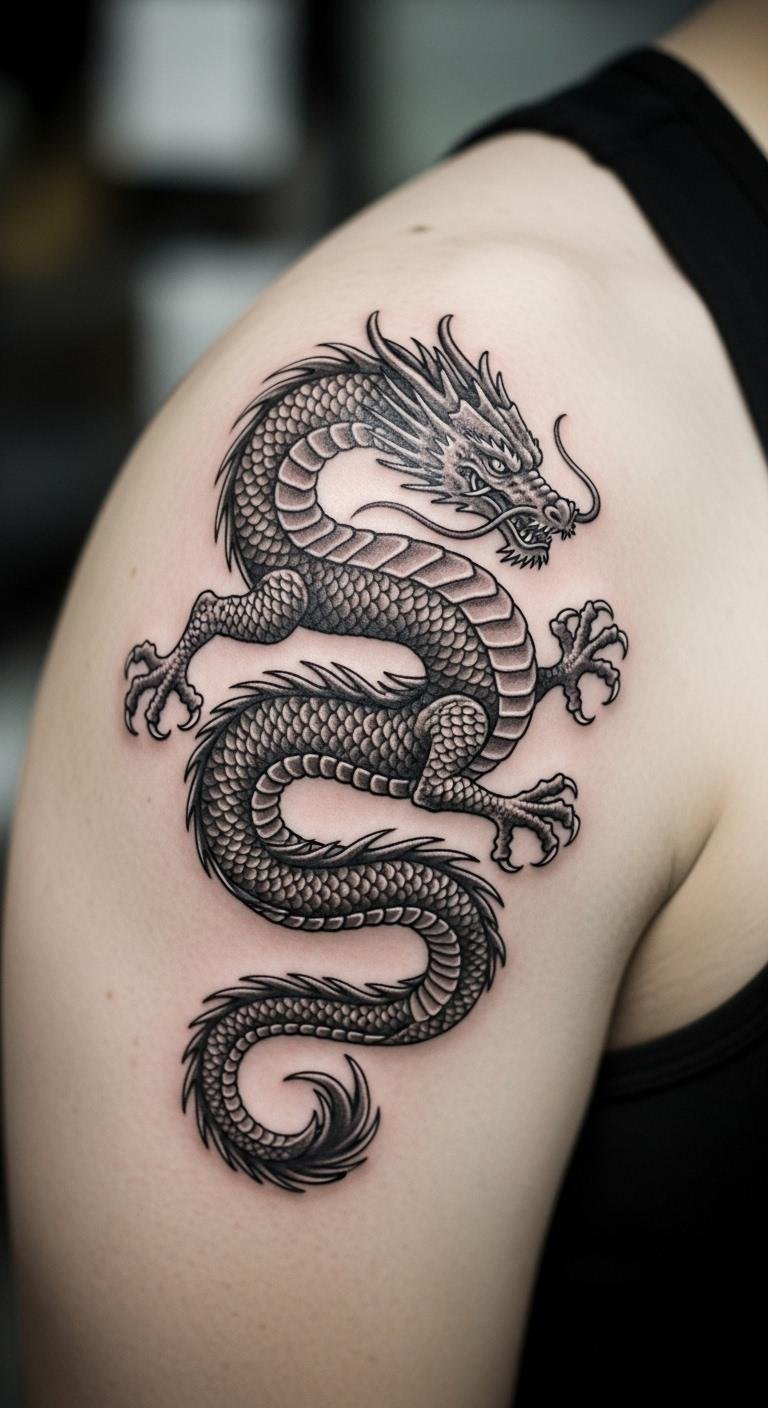 Put a black and gray dragon on your shoulder for a clean, timeless feel. Draw it on with a marker at home to check the fit before committing. Opt for basic ink to keep prices down—sessions might run $50 to $100. Focus on the dragon’s tail wrapping around the curve of your shoulder for better flow. Use free apps on your phone to edit designs and see how it looks. Heal it quick by keeping the area clean with soap you already have. This design works well under clothes, making it practical for work. Try a DIY version with henna kits from the drugstore, lasting a few days for $10. It gives you that shoulder strength symbol without the permanence yet.