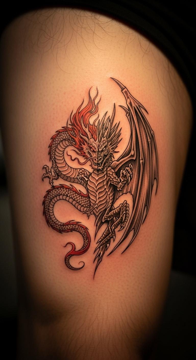 A hybrid dragon on your thigh mixes ideas. Combine sketches on fabric to experiment. Go for merged elements to save on price, under $85. Make it small for easy healing. Use hybrid stickers for previews. Cover with clothes as needed. This tattoo shows your unique side. For DIY, layer drawings with colored tape. It makes your thigh a canvas.