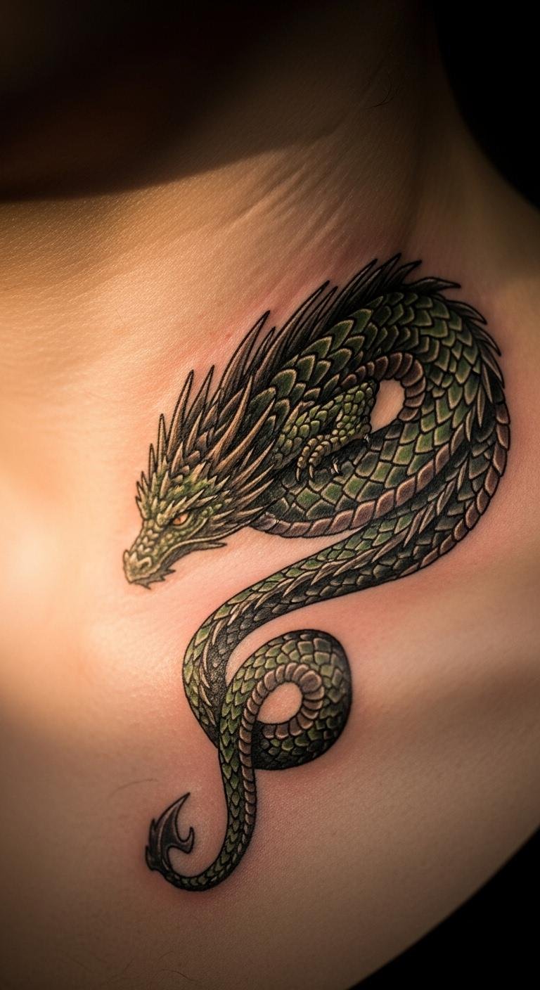 A scale dragon on your collarbone adds texture. Sketch scales on a template at home. Opt for detailed but simple for budget, about $70. Make it fit for fast healing. Get collarbone stickers. Cover with a necklace. This design shines subtly. Try DIY with textured paper. It layers on the bone nicely.