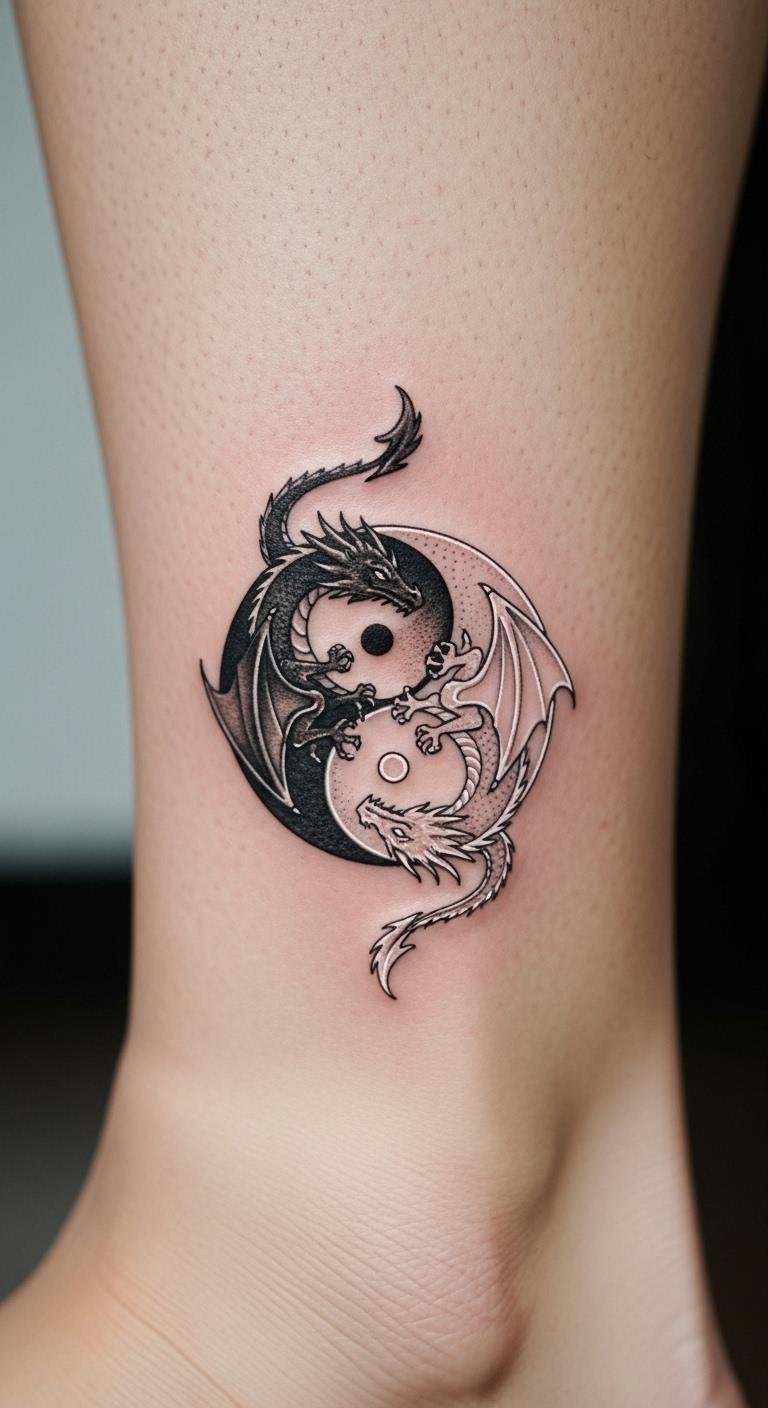 A yin-yang dragon on your lower leg balances life. Draw the halves on paper to plan. Pick balanced lines for affordability, about $65. Keep it small for quick heal. Get leg stickers. Wear long pants. This tattoo harmonizes your step. Try DIY with dual-colored markers. It pairs opposites perfectly.