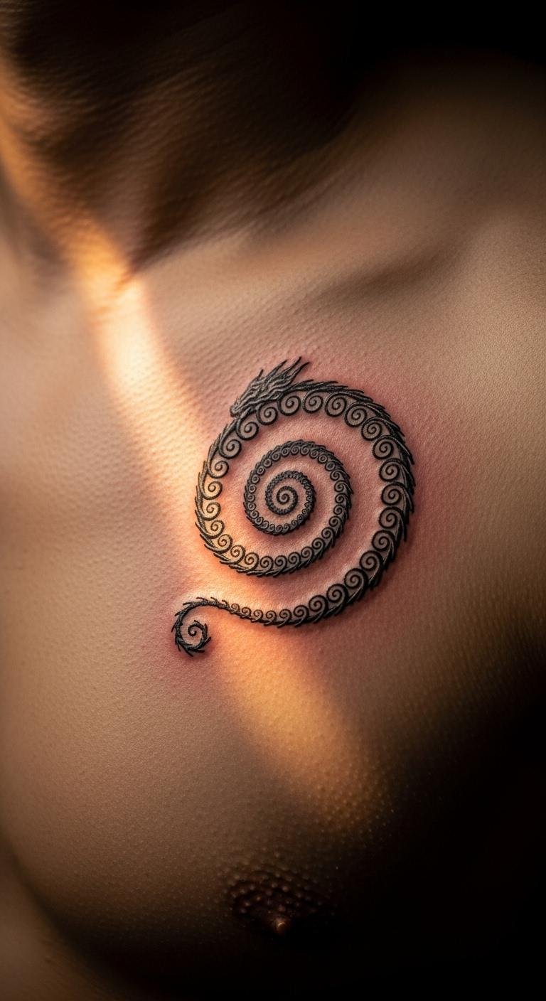 A spiraled dragon on your chest coils inward. Spiral it on paper to start. Choose coils for affordable design, around $80. Size for healing ease. Get chest stickers. Button up if needed. This tattoo spirals motivation. For DIY, twist string into patterns. It centers your core.