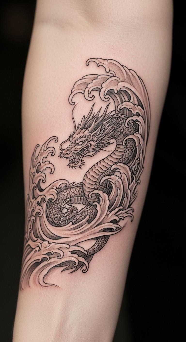 A water wave dragon on your forearm blends elements smoothly. Try drawing waves around a dragon shape on paper at home. Choose a design with soft lines to keep it affordable, under $80. Make it 2 inches to fit the arm and heal quickly. Get wave stickers for cheap to test the combo. Protect it with a sleeve from your wardrobe. This tattoo flows with your movements, adding a calm vibe. For DIY, use blue tape and markers to mock it up. It makes daily tasks feel more grounded.