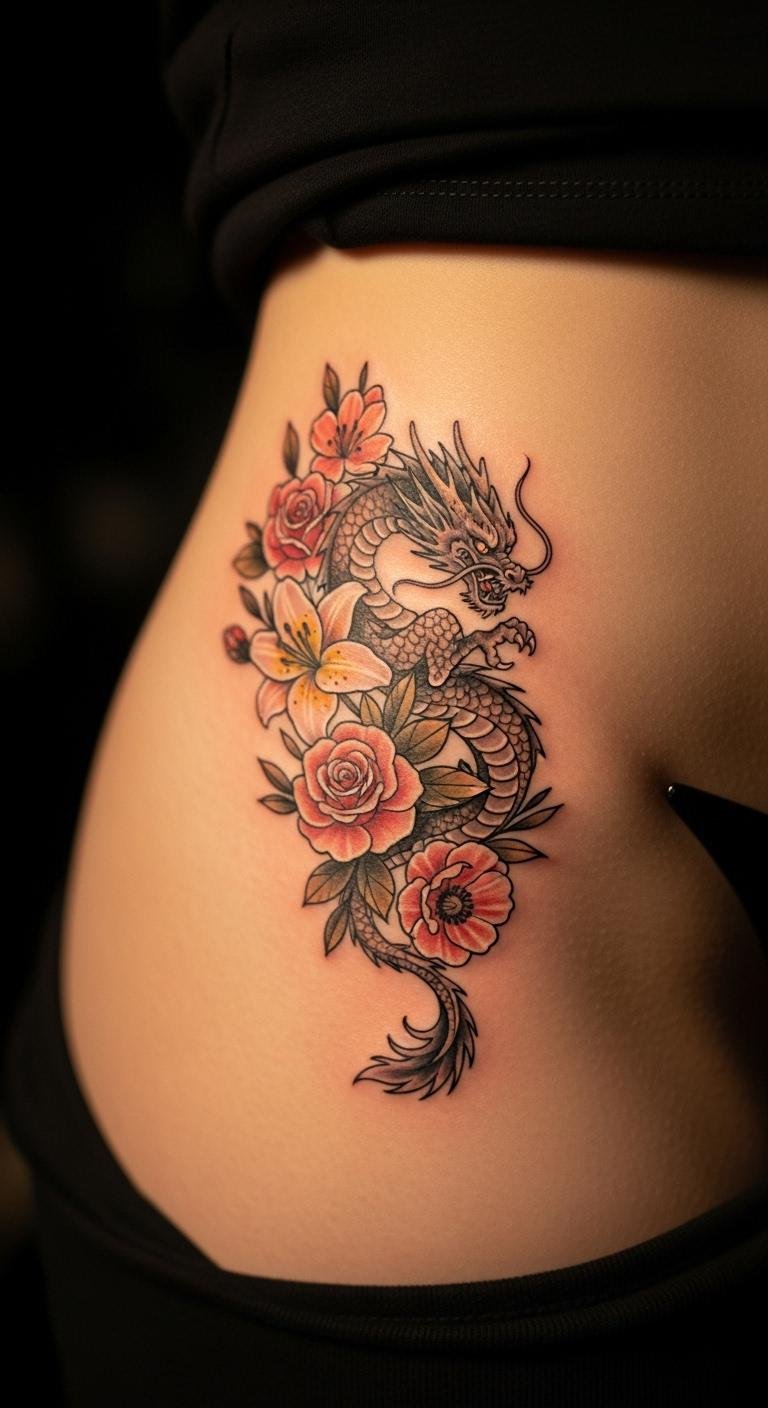 A floral dragon on your hip mixes beauty and power. Draw flowers around a dragon on cloth to test. Go for basic petals to save money, about $90. Size it to 1.5 inches for quick recovery. Buy floral stickers online for under $5. Use a band from home to protect it. This design blooms with your confidence. For DIY, press flowers and trace over them for a fun practice. It turns your hip into a personal garden.
