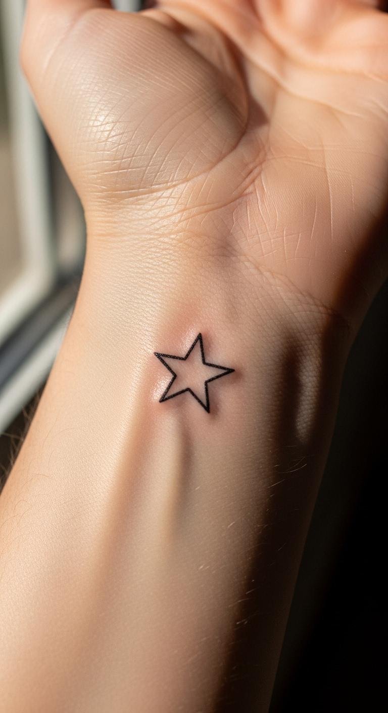 A small star tattoo on your wrist makes a great starting point for first tattoos. It represents guidance and hope in a tiny package. Pick a simple design with one or two lines to keep it easy on the wallet. For example, sketch a basic star on paper first to see how it looks. This helps you decide without rushing. Go for a local artist who does fine-line work; sessions often cost under $100. Choose black ink for longevity. If you’re on a budget, look for flash sales at studios. Bold the key: fine-line stars last well with proper care. Try drawing your own version at home using a pen and mirror. Keep the size small, like one inch, for less pain and faster healing. Add a personal twist, such as adding a dot for a birthdate. This idea suits busy folks who want something visible yet subtle. Plan your visit during off-peak times to save money. Remember, clean the area gently afterward. Overall, it’s a fun, affordable way to feel good about your choice.