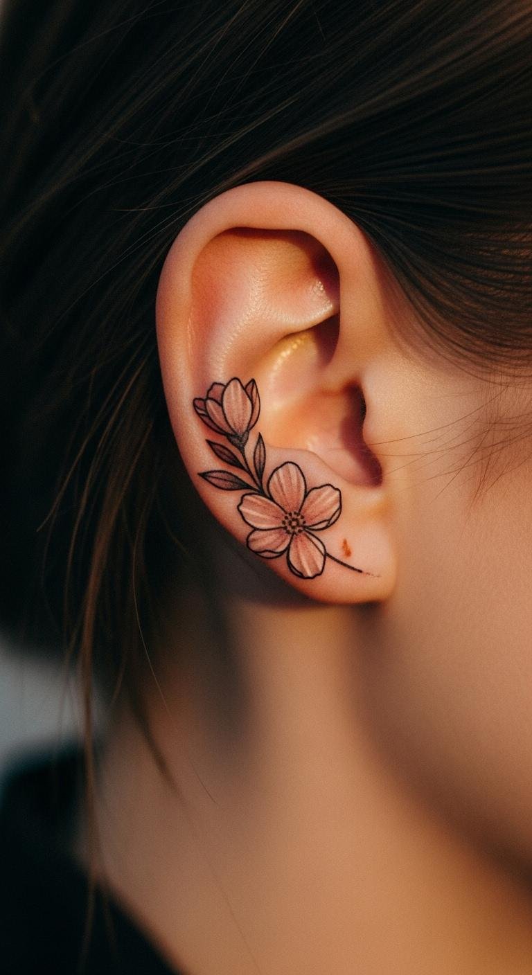 A floral design behind the ear offers a discreet and pretty option for daily wear. Flowers symbolize growth and beauty in a compact form. Start by picking a simple daisy or rose outline to match your budget. Draw a few ideas on your skin with a washable marker before committing. Artists charge around $50 to $150 for this size, making it accessible. Opt for black and gray shades to avoid fading issues. For a DIY feel, practice sketching flowers on paper to refine your concept. Bold the key: floral tattoos work best in hidden spots. Schedule an appointment at a budget-friendly shop and bring your reference. Healing takes about two weeks with basic lotion. This design fits anyone wanting a touch of nature without much commitment. Go small, like half an inch, for quick sessions. Add leaves for extra meaning if you like. It’s an easy way to express yourself without high costs. Check for artist portfolios online to find good deals. In short, this choice lets you enjoy art on your terms.