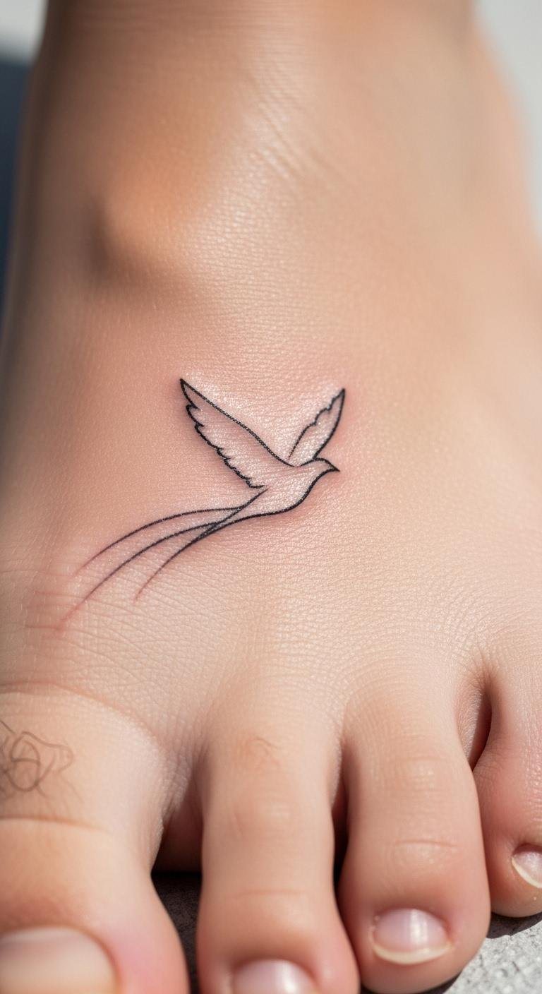 A bird in flight on the toe represents dreams on the go. Birds mean freedom in tiny designs. Draw birds at home to plan. It keeps costs low. Fees are around $50. Use light lines. Bold the key: bird tattoos are subtle. Look for options and prep. DIY by tracing birds. Make it compact. Add wings. This idea fits adventurers. Schedule early. Care is easy. It’s a flying start.