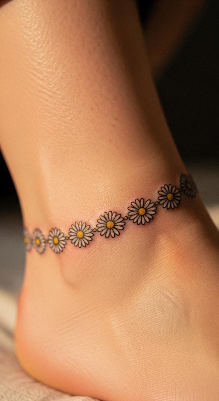 Daisy chain links on the ankle create a floral chain of joy. Link a few daisies. Use temporaries to check. Draw chains at home. Cost $60. Petal details delight. Bold this: Keep clean. Heal smoothly. Wear with straps. Chained blooms on a budget.
