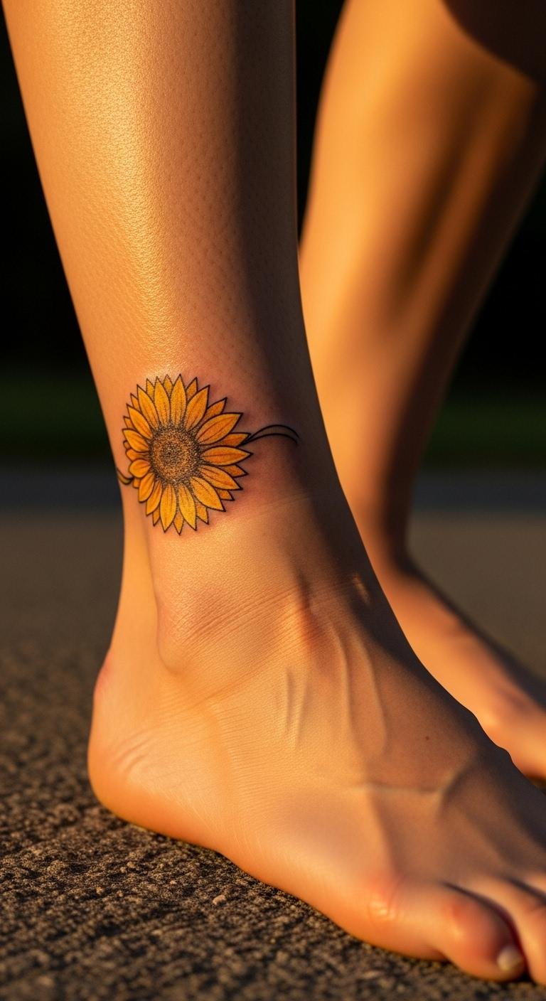 Sunflower wrap tattoos around the ankle bring sunshine and positivity in a loop design. Keep it small, circling the bone. Test with temporaries online for $5. Sketch sunflowers on your ankle at home using yellow markers. A session for the real thing is $60-$90. Bold outlines make it pop. Bold this: Apply sunscreen daily. Let it breathe while healing in 10 days. Wear with anklets for fun. This affordable choice lights up your step.
