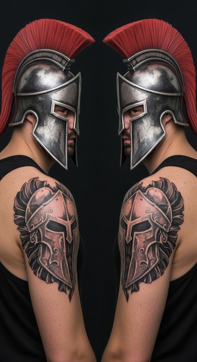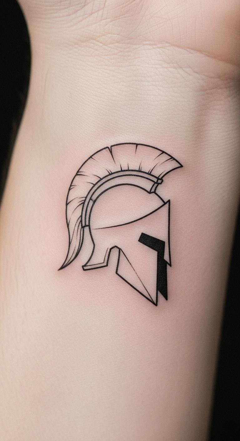 Go for clean lines that say a lot with little ink. A minimalist Spartan helmet uses basic shapes to show strength without fuss. Draw your own version on paper using a ruler and freehand strokes—grab supplies for under $5 at any store. This keeps costs low, around $50 to $100 for a session. Place it on your forearm for quick access in mirrors. Add a small twist, like a single line for a crest, to make it yours. For budget tips, check artist flash sales online and book ahead. Practice with washable markers at home to test placements. This design fits under clothes for work yet pops at the gym. Keep things straightforward: aim for sessions that take less than an hour to save time and money.