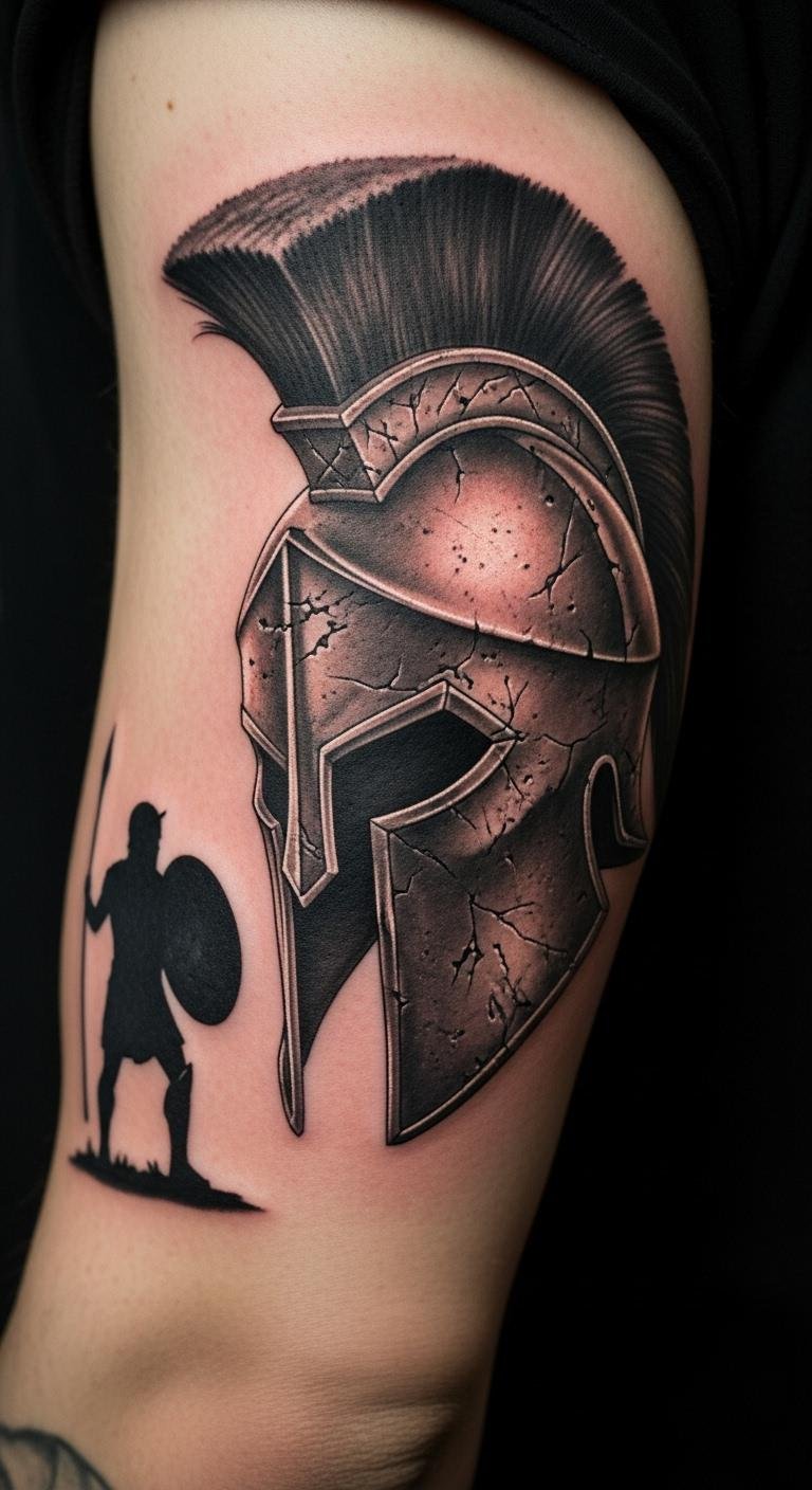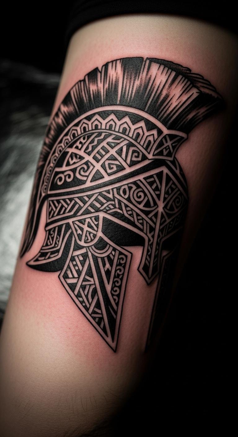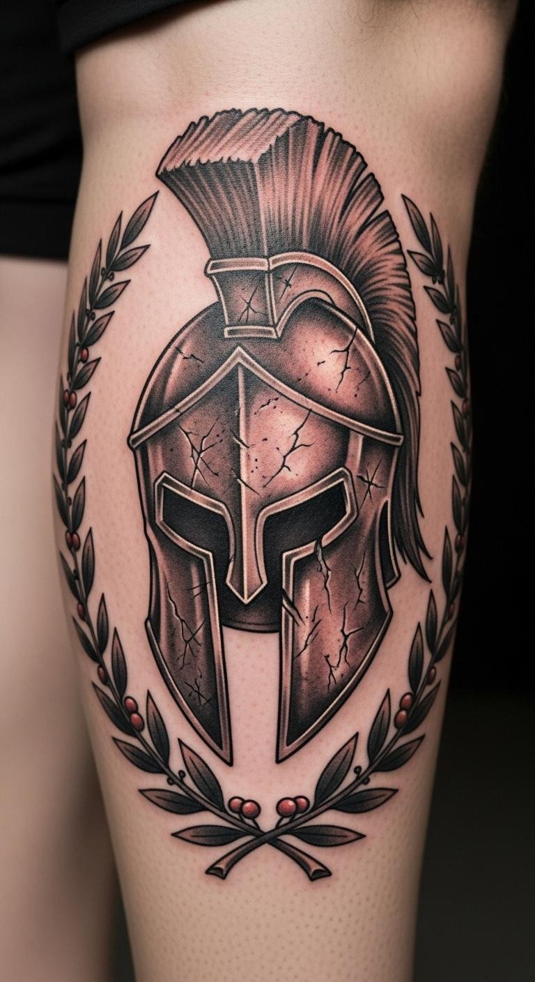 Crown your design with victory. A Spartan helmet with a laurel wreath signifies triumph. Trace templates at home—simple supplies needed. Cost around $110. Put it on your leg for balance. Add leaves for emphasis. Find bundle deals at studios. Use string to outline at home. This combo inspires daily. Opt for efficient visits.