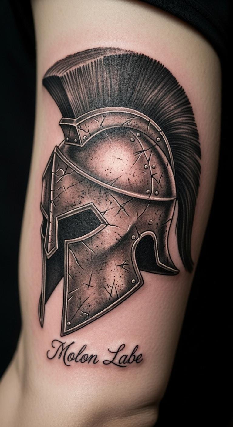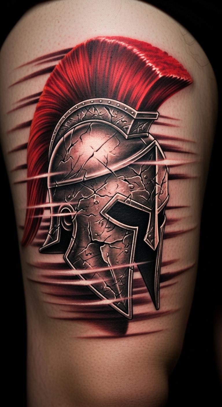 Show movement in your ink. A Spartan helmet with motion lines suggests charge. Draw arrows at home—simple tools. Budget $110. Place on thigh for action. Blend lines creatively. Find motion-themed events. Preview with drawn guides. This design energizes. Opt for quick setups.