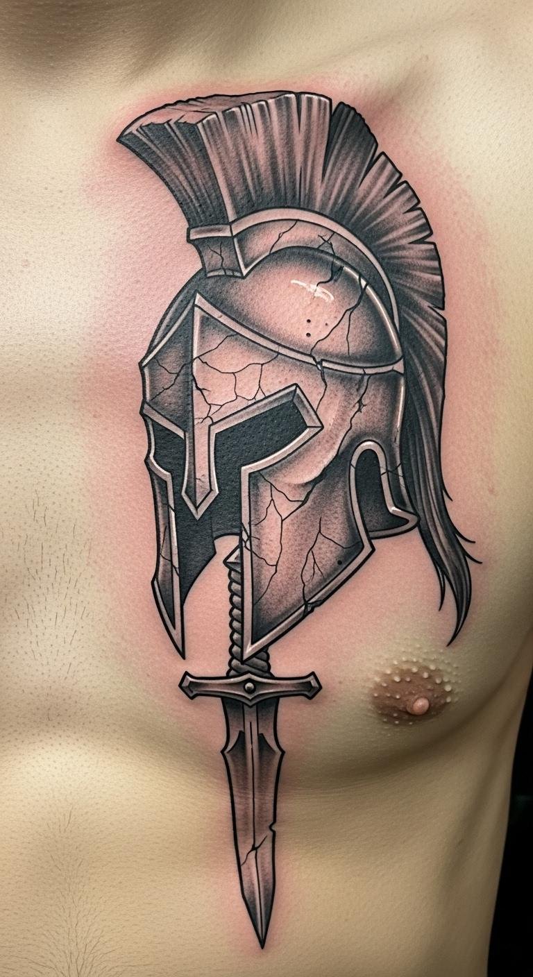 Combine power symbols for a story on your skin. A Spartan helmet with a sword adds edge, representing battle readiness. Sketch both on paper first with everyday pens—mix free templates from the web. Opt for affordable black-and-gray ink, costing about $150 total. Put it on your back for a grand look without daily visibility. This setup lets you personalize, like aligning the sword with your arm’s curve. Shop around for artists with portfolio discounts. Use string or tape at home to preview the layout on your body—it’s free and easy. This design works for casual or formal settings, blending seamlessly. Focus on quick, one-session options to fit your schedule.