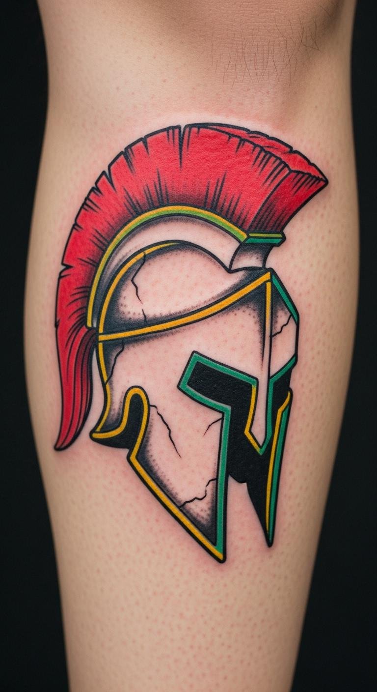 Brighten up with hues on the crest. A colorful Spartan helmet focuses on the top. Color in drawings at home—markers work. Budget $140. Position on calf for flair. Mix colors creatively. Find pigment sales online. Test shades with makeup. This adds personality. Keep visits manageable.