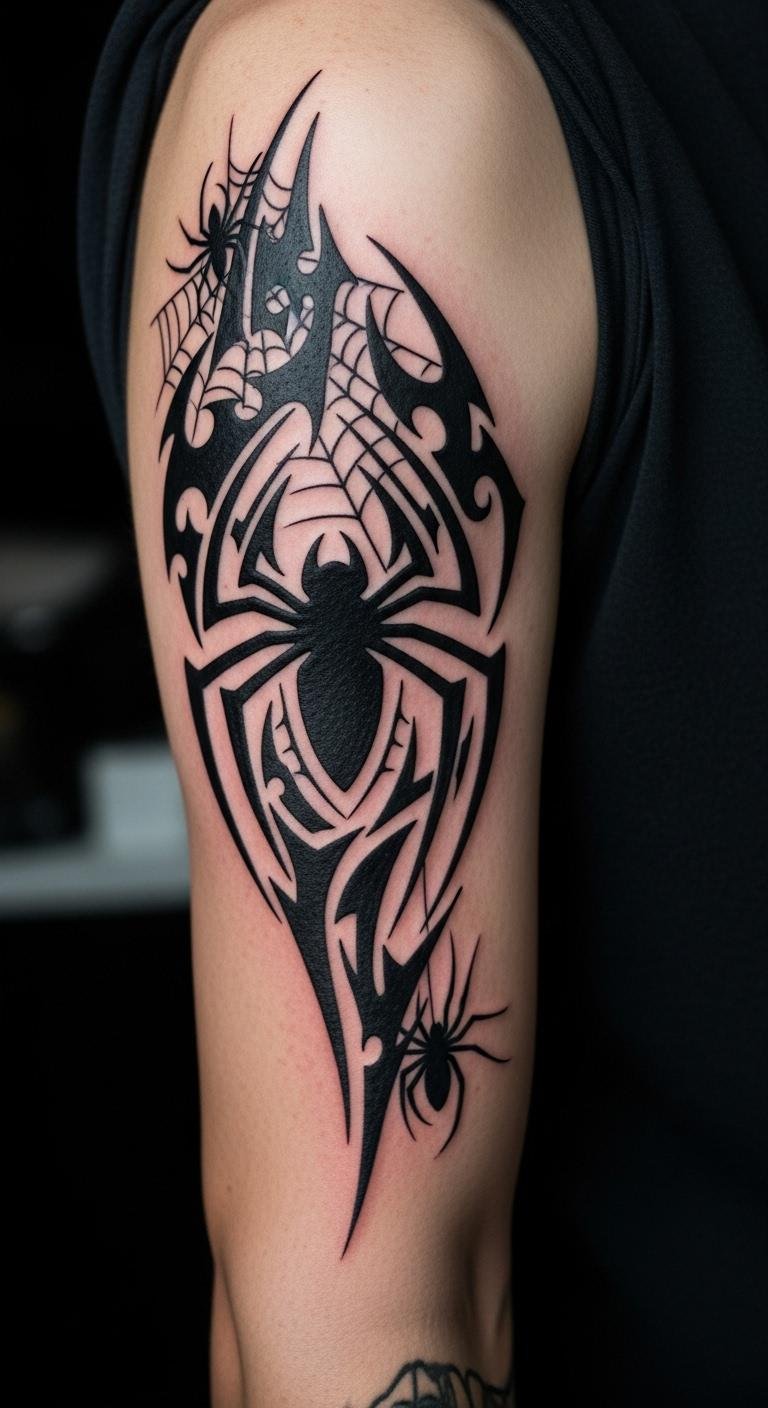 Fuse tribal elements with Spiderman on your bicep for a cultural mix. Lines and spiders merge. Trace tribal designs on paper. Find fusion artists at fairs. Carve a temporary with clay tools. Use household items. Flex it for show. Cover with sleeves. Clean regularly. This tattoo honors roots.