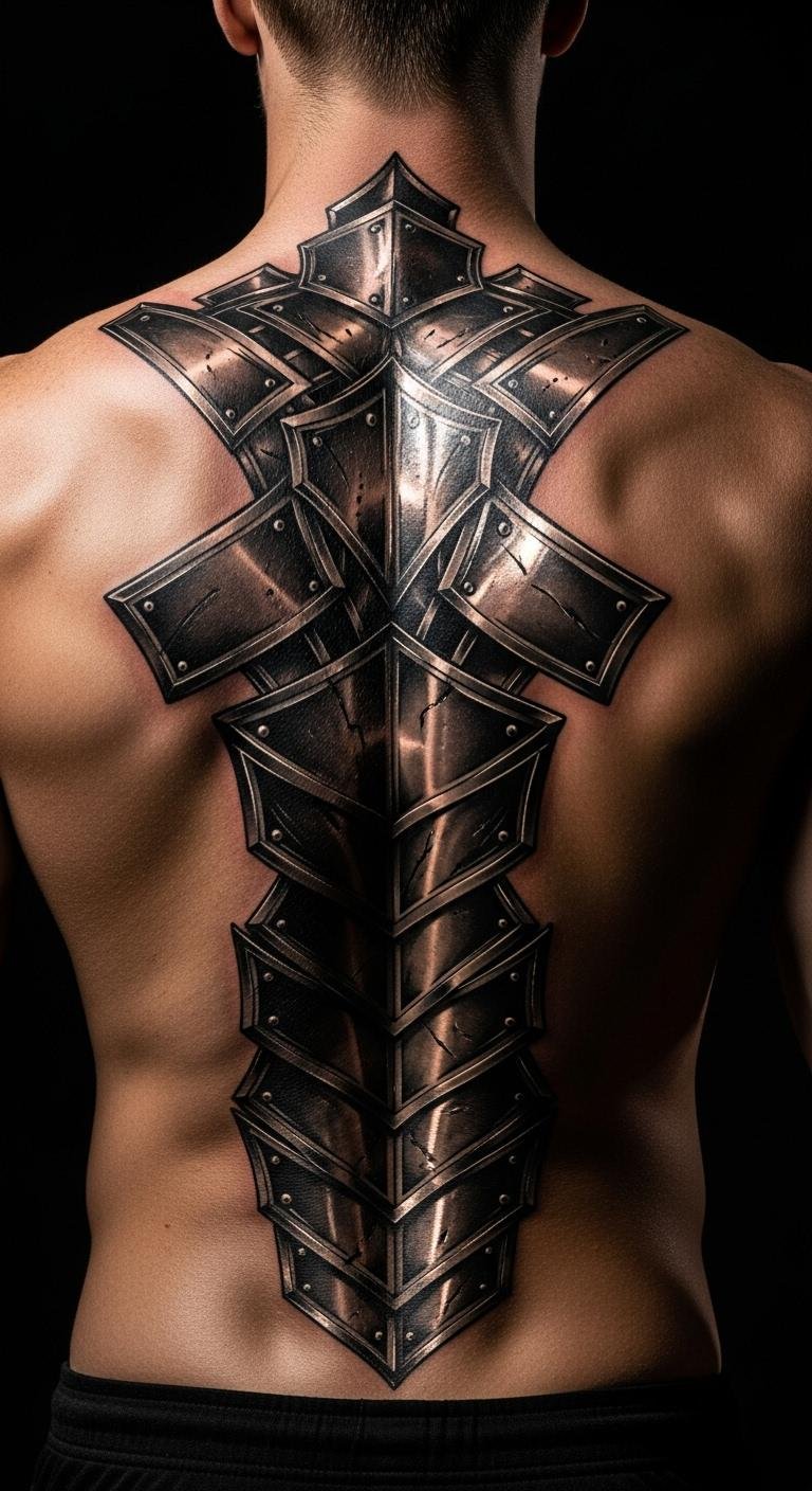 Armor plates signify defense and resilience. Sketch plates at home—easy. Seek $135 sessions. Fit to spine. Use household balm. These designs fuel confidence through protection. DIY with templates. Keep edges sharp. Protect during healing.