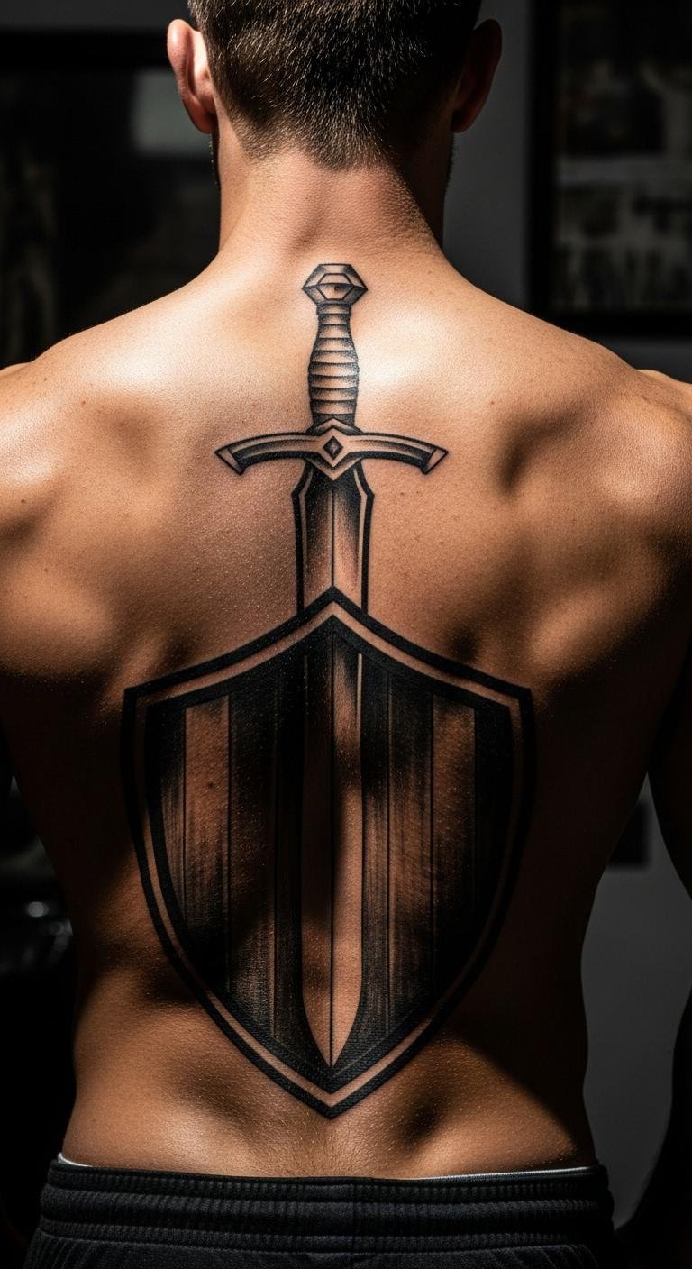 Sword and shield embody readiness and courage. Draw weapons on paper—free. Find artists for $115. Align with spine. Apply daily cream. This ink enhances confidence through defense. Use DIY stencils. Choose solid ink. Heal carefully.