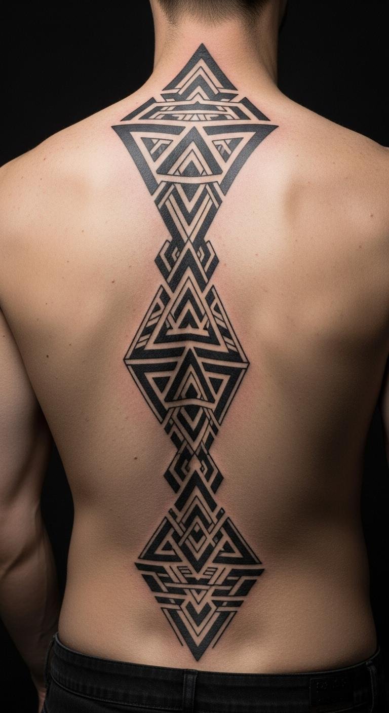 Geometric lines offer modern strength on your spine. Draw simple shapes like triangles on paper at your desk—it’s quick and free. Seek artists offering flash deals for about $100. Choose repeating patterns for easy application. Use a basic moisturizer from your bathroom for care—apply twice a day. These tattoos enhance confidence with clean, structured looks. Experiment with DIY mirrors to visualize placement at home. Keep designs minimal to speed up sessions. Focus on bold edges for a striking finish.