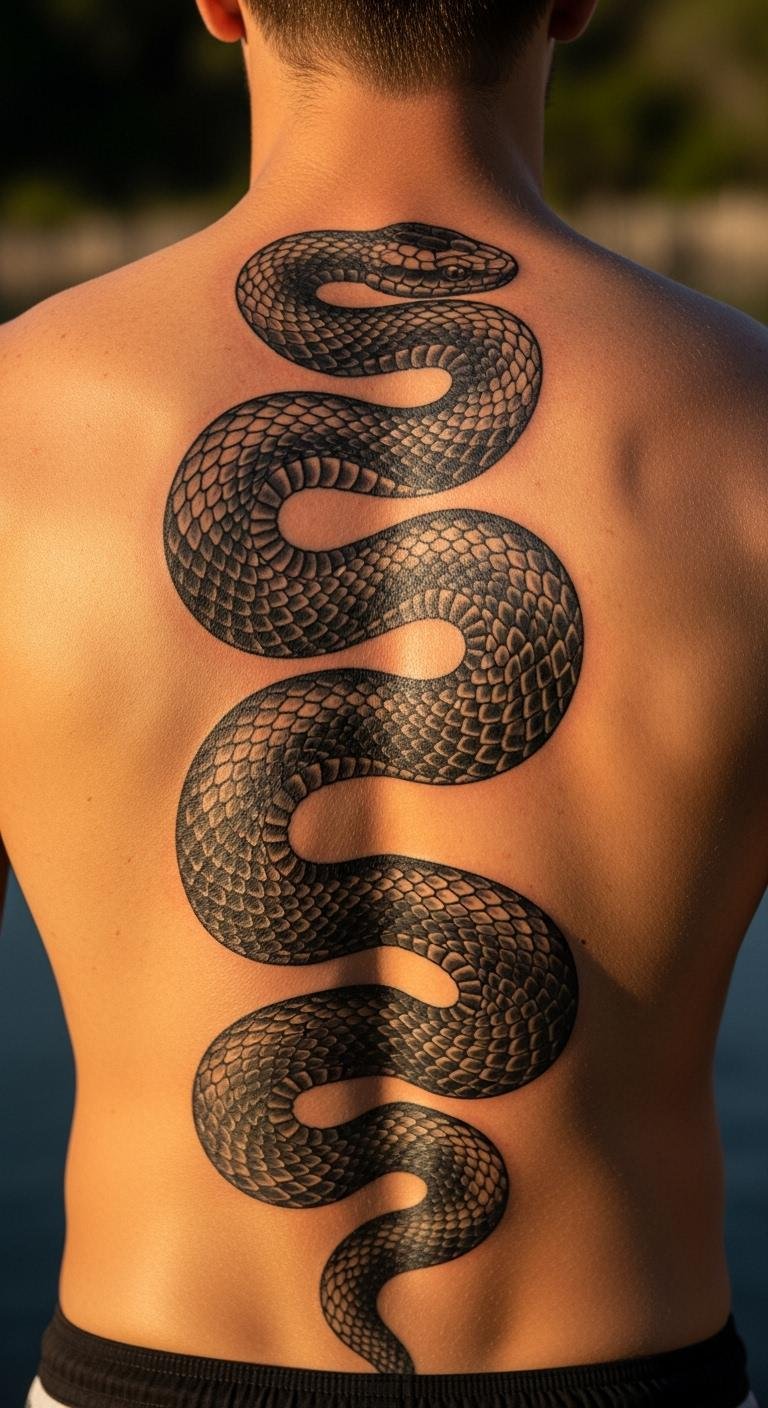 A coiling snake tattoo stands for transformation and agility. Sketch a snake shape on paper using a marker—do it in minutes at no cost. Find budget artists online for sessions around $120. Position it along the spine for flow. Grab unscented lotion from your kitchen for healing—use it gently. This design sparks confidence by symbolizing adaptability. Add personal scales with free stencil tools on your computer. Aim for black ink only to cut expenses. Cover with loose fabrics during recovery.