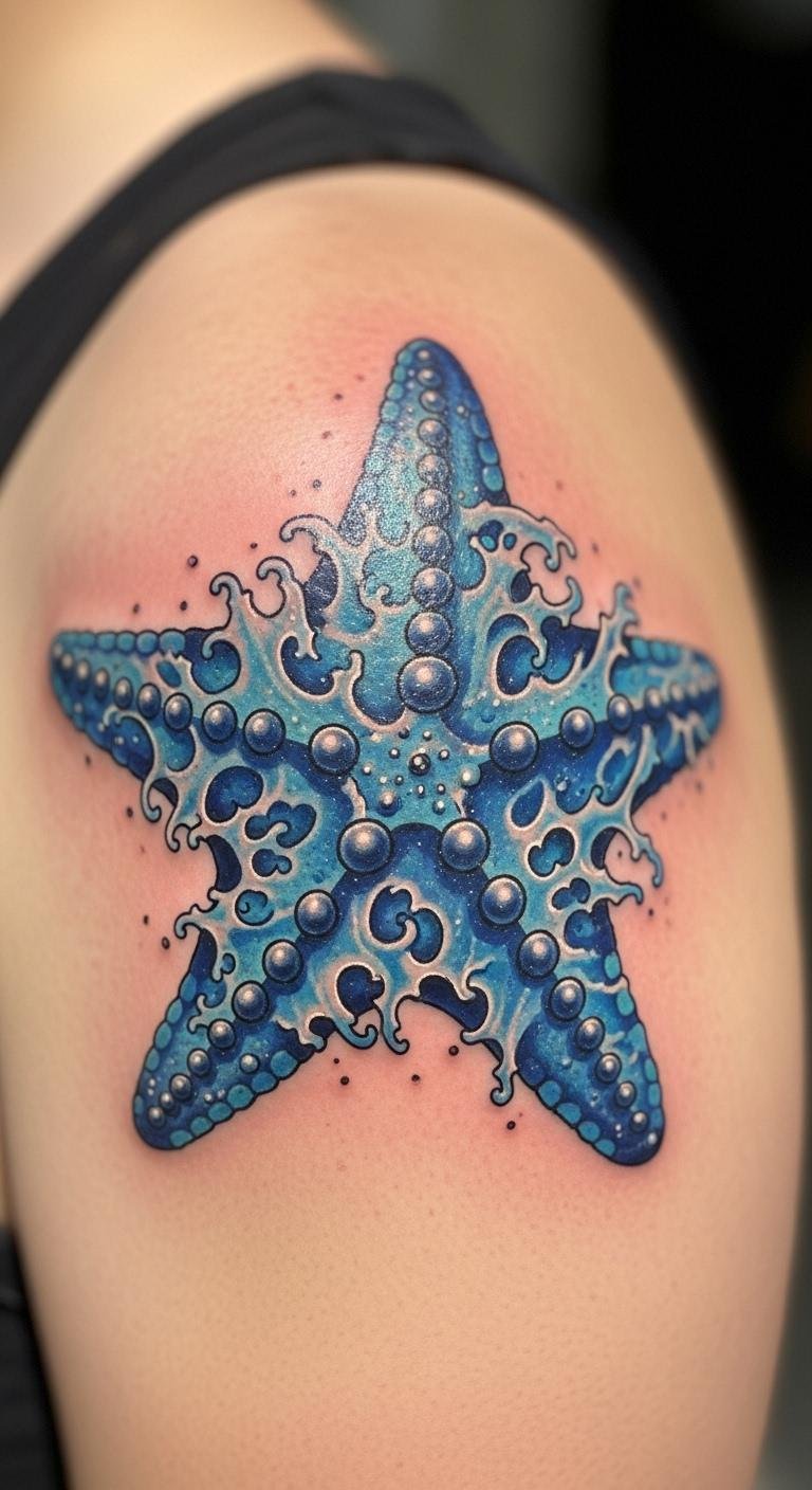 Blue starfish tattoos bring calm to your skin. They mimic the sea’s peace. Choose shades from light sky to deep navy. This adds a personal touch. Place it on your shoulder for easy hide or show. It pairs well with daily outfits. Save money by drawing ideas on your phone app first. Free drawing tools let you experiment. Find an artist who uses affordable inks. Prices start at $80. Add waves around the starfish for extra flair. This creates a full scene. Keep the design small to avoid high costs. Bold the key: blue hues. After getting it, use gentle lotion daily. Simple actions keep colors bright. This tattoo sparks joy every day.