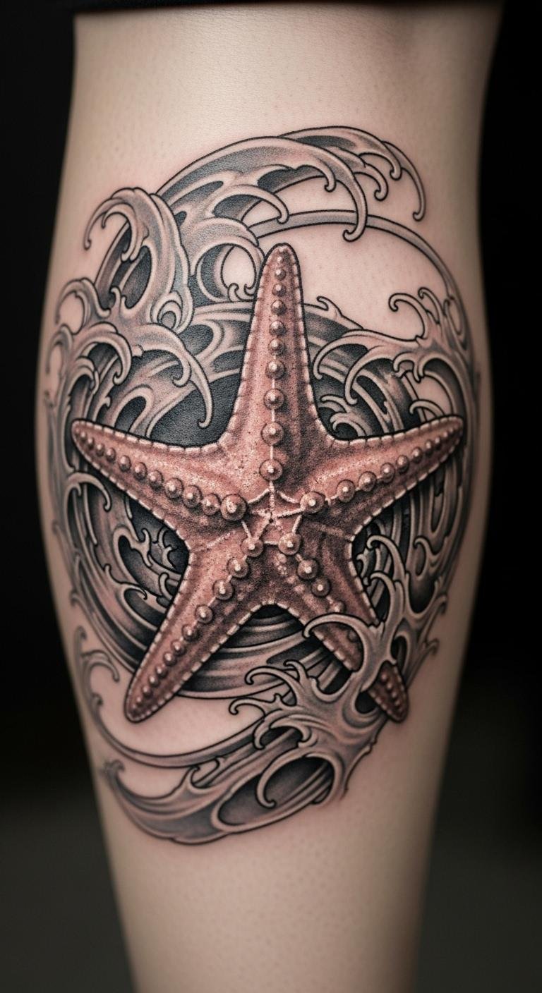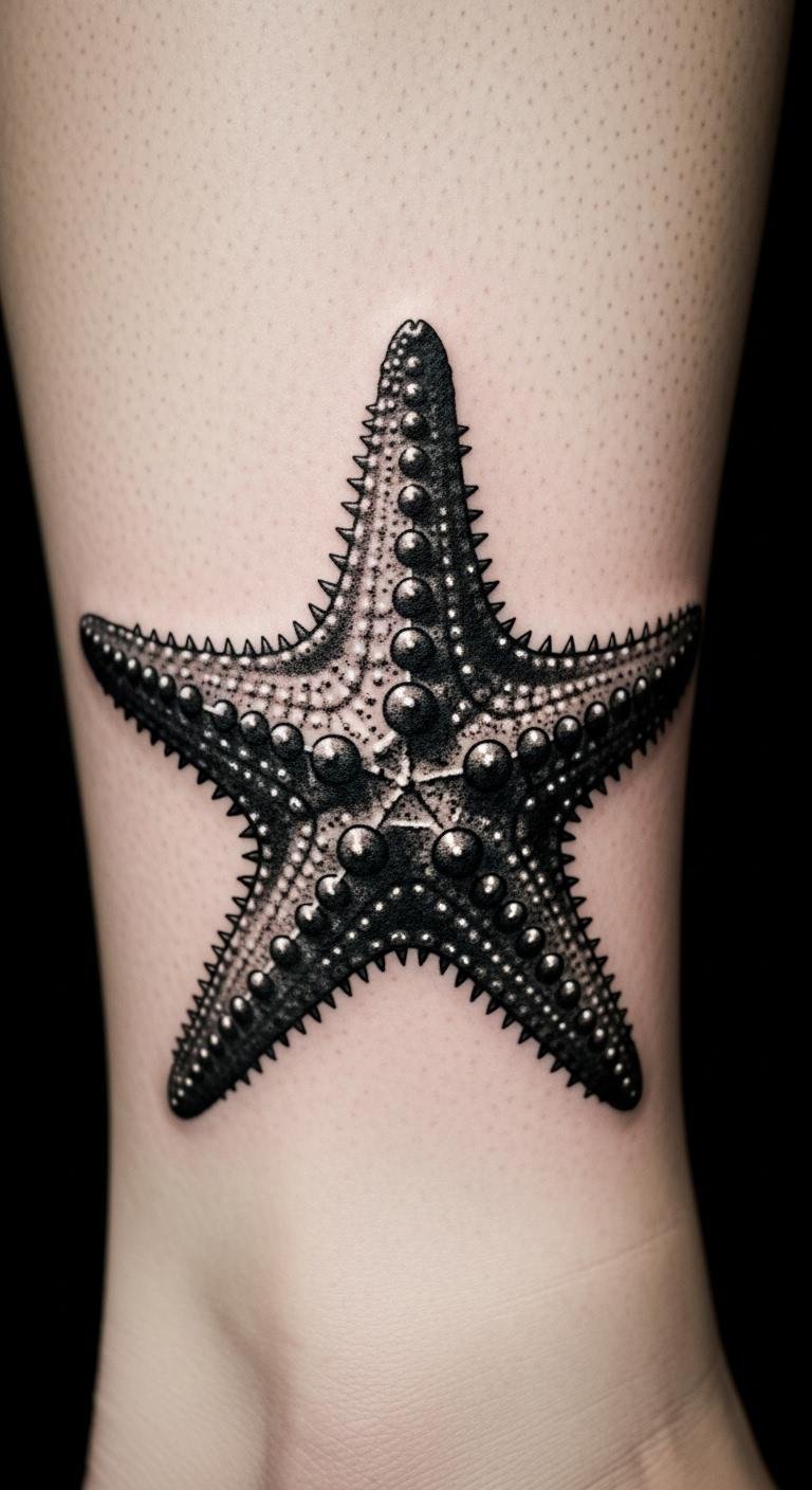 Black and white keeps it classic. Place on your leg for impact. No colors mean lower ink prices, about $50. Sketch in grayscale at home. Bold the key: black and white starfish. Keep it dry for days. Simple routine works.