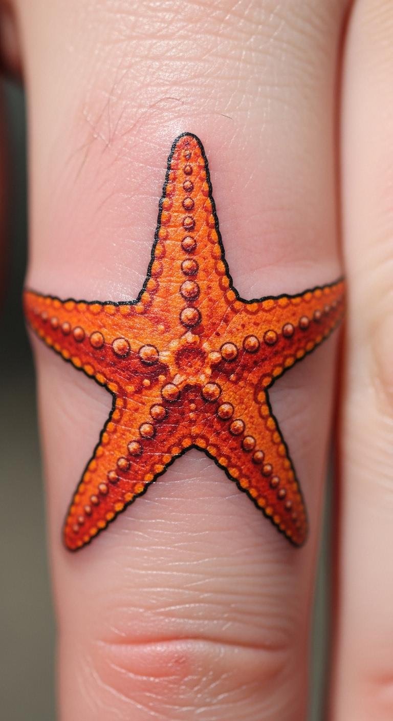 Orange adds creativity to finger tattoos. A starfish here feels playful and small. It fits under rings or watches. Trace the shape with colored pencils at home. Free online guides speed it up. Sessions cost about $40 with the right spot. Bold the key: orange starfish. Protect it with bandages for a week. Easy habits keep it sharp.