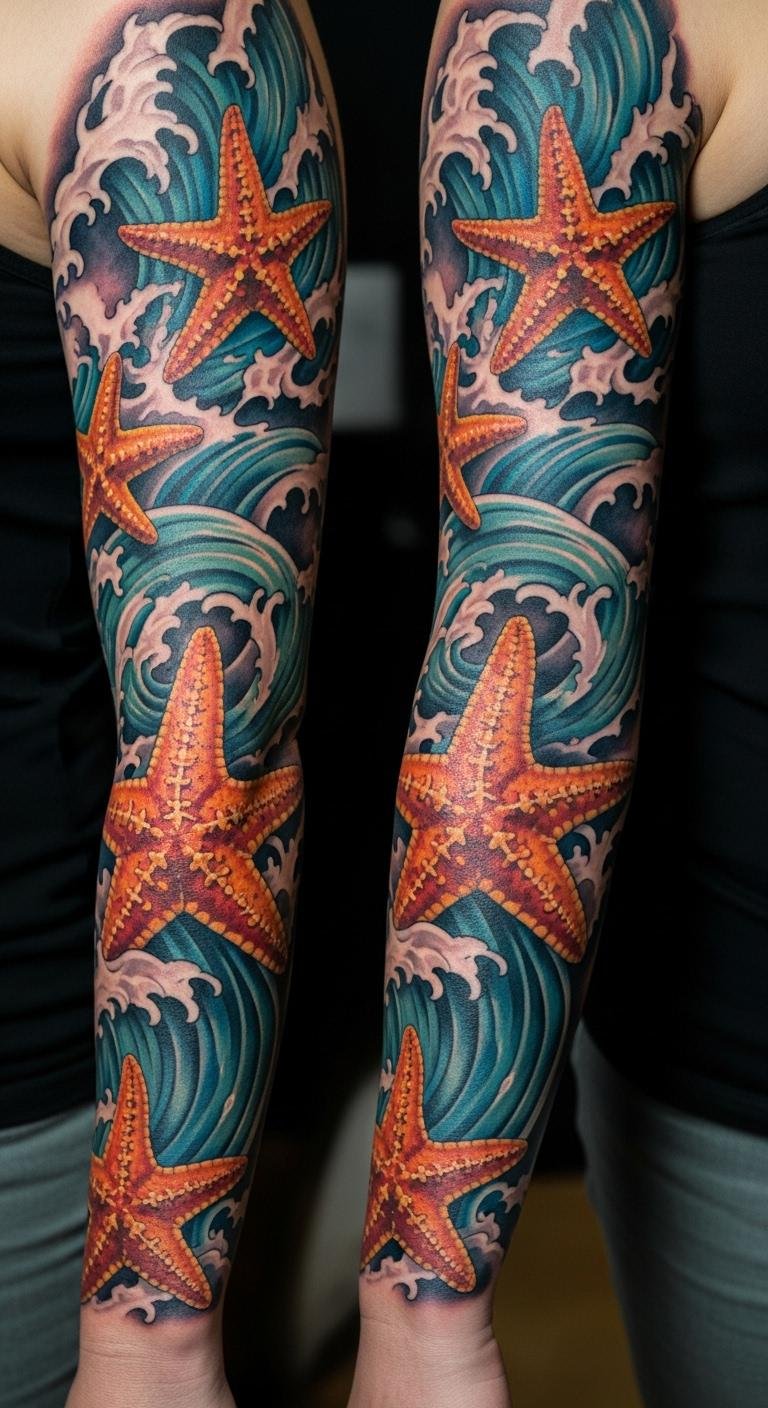 Build a sleeve with starfish and waves. It covers the arm in ocean stories. Start small to keep costs down, around $200 total. Draw wave patterns at home with ease. Bold the key: starfish sleeve. Rest the arm after sessions. This aids healing.