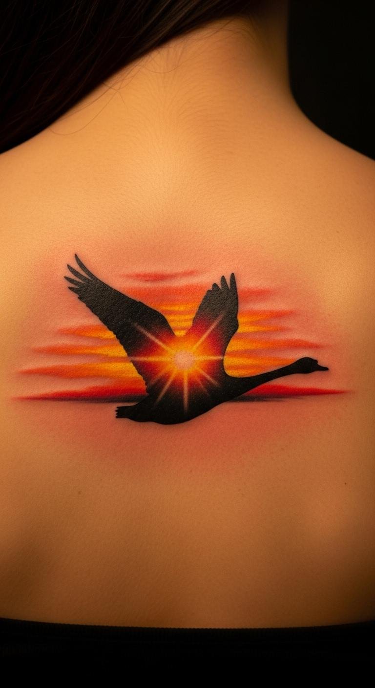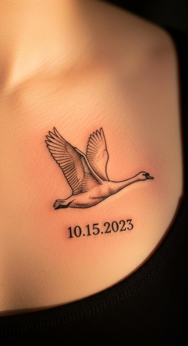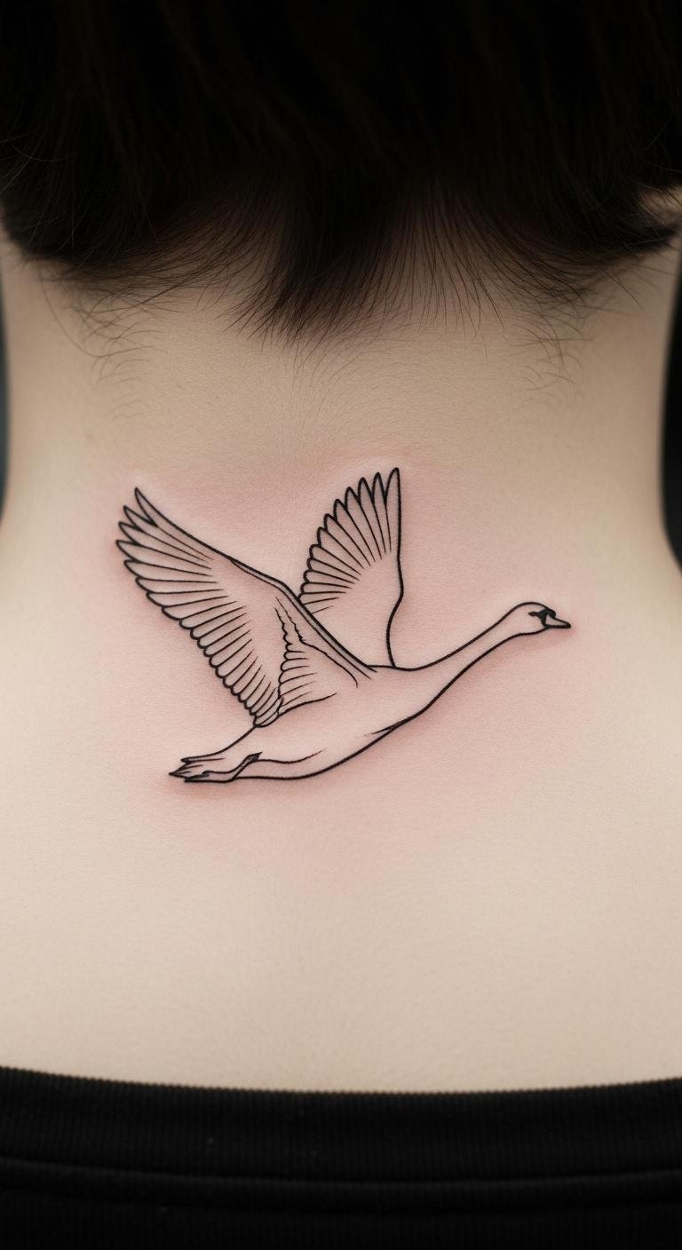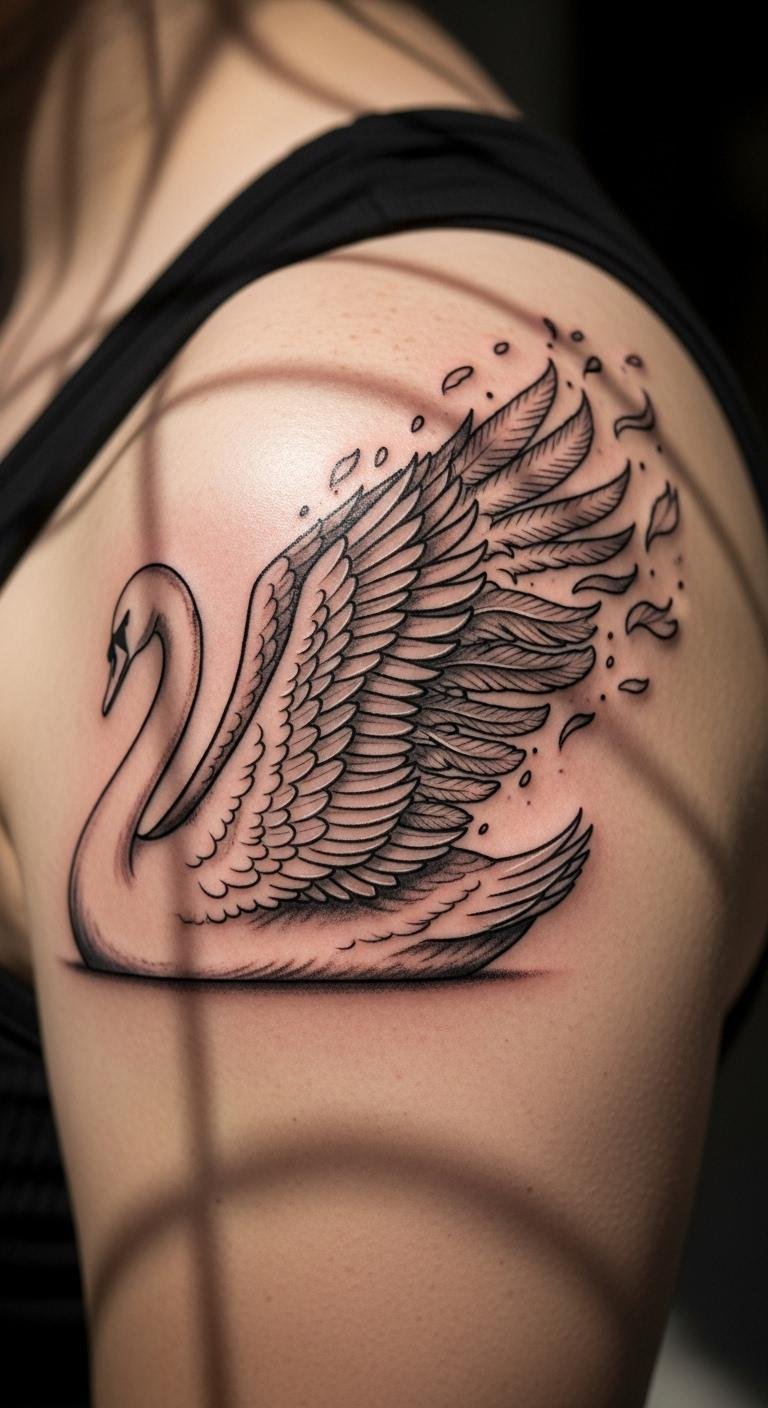 Make it look alive with realistic details. A swan in flight shows feathers in motion. Practice shading with pencils on paper. Put it on your shoulder blade for impact. Use phone apps for realistic previews. Costs around $90 at a studio. This one tells a story of freedom. Try bird photos as references for your sketch.