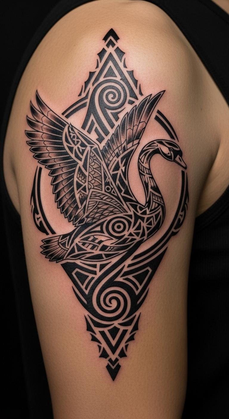 Add bold patterns for a tribal vibe. A tribal swan mixes sharp lines with traditional motifs. Use a marker to outline on your skin first; it’s free and safe. Opt for your bicep for strength. Free websites offer patterns to adapt. Artists charge about $70 for this. Draw inspirations from cultural books at the library. This design highlights heritage. Experiment with string art at home as a preview.
