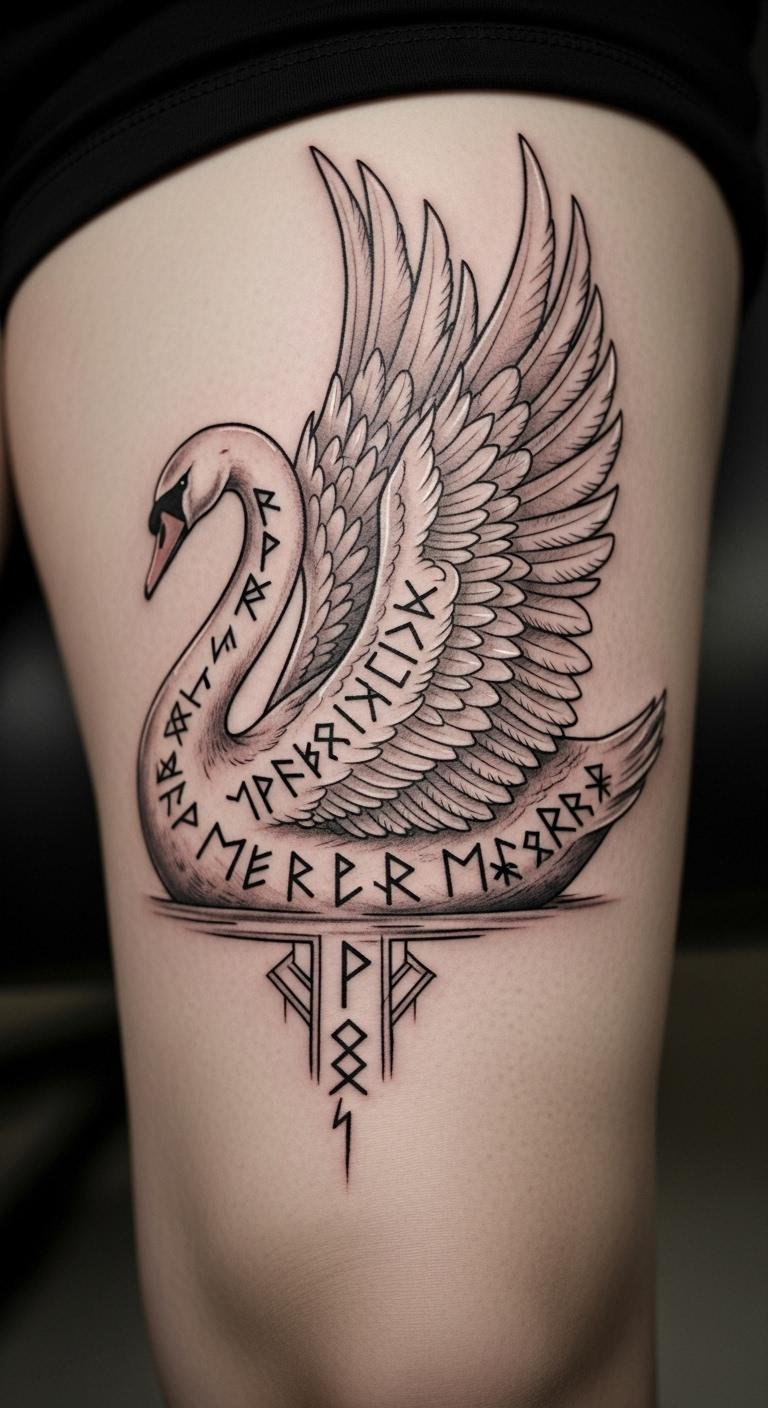 Bring myths to life with Valkyrie touches. Add runes around the swan. Sketch ideas with markers. Position on your thigh for privacy. Free myth resources guide designs. Costs about $75. This one connects to stories. Use old books for inspiration sketches.