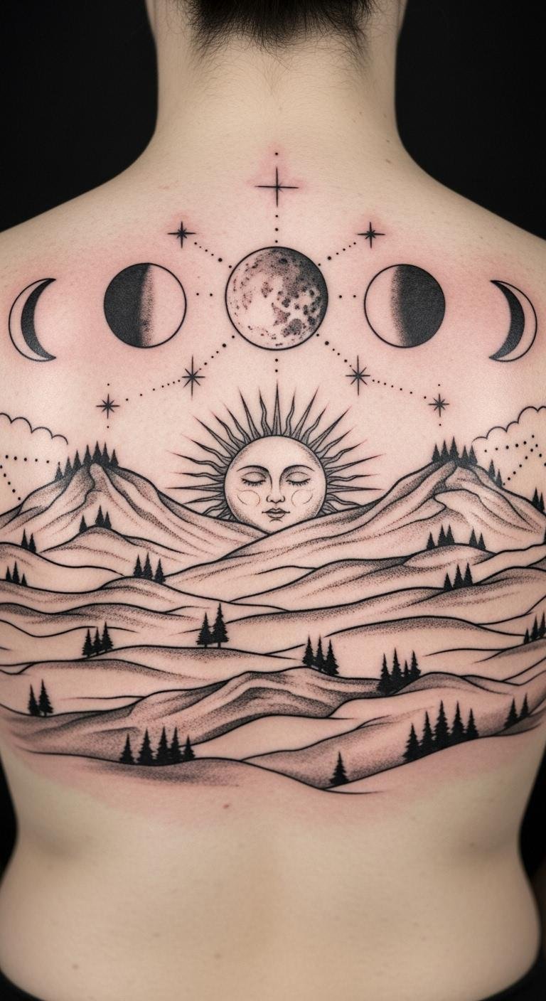 Landscape tattoos create escapes. Go for your back. Sketch scenic views. Download landscape generators. Find landscape pros. Use mural stickers. Add horizon lines. Include your dreams. This tattoo transports you. Choose large spaces. Customize dreams. Make it real.