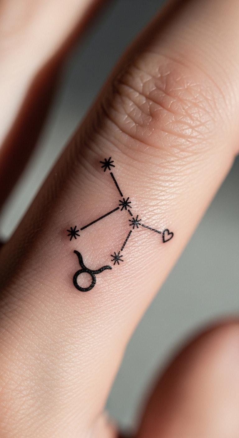 Integrate a heart for loyalty in your design. Sketch the constellation and add a heart with a basic pen—do it in minutes at home. Look for finger tattoo specials to save money. Wear it on your finger for a constant reminder. Trace from a printed heart template for accuracy. This adds meaning affordably. Place the heart near the bull’s center.