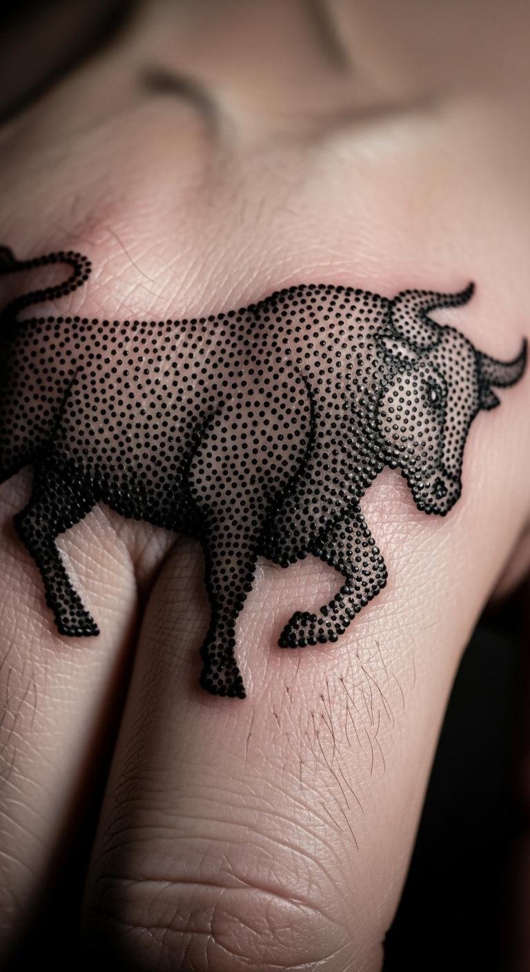Use dots to build your bull on the knuckle for a textured feel. This is detailed yet small. Dot on paper. Test with pens. Flex for view. Add dots personally. Under $20. Easy: dot, pen, ink. This design points clear.