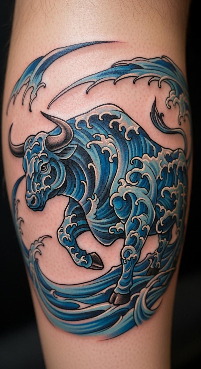 Surround your bull with waves on the shin for a dynamic effect. This flows. Draw waves. Use leg wraps. Cover with pants. Personalize waves. $50 deals. Steps: wave, wrap, ink. This design moves.