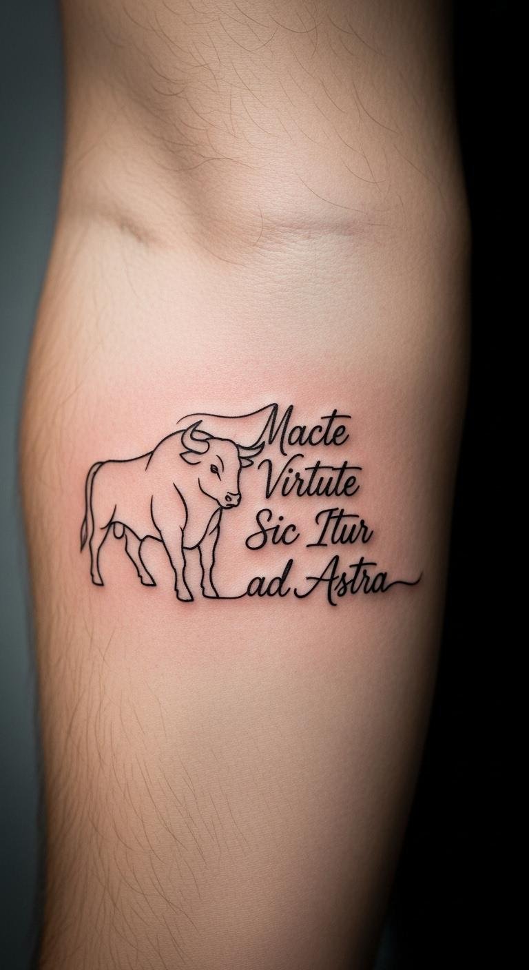 Pair your bull with a short phrase on the inner arm for added meaning. Choose words like “stay strong.” Write it out on paper first. Use printable stickers to mock it up. Place it for easy glances. Make the quote your own from daily thoughts. Budget sessions start at $40. Quick plan: note ideas, test, ink. This combines symbols affordably.