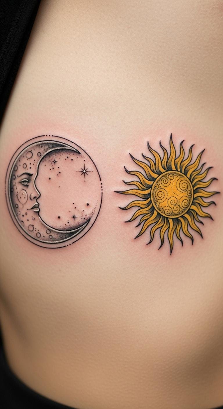 Sun and moon tattoos mean balance and light. They shine together in harmony. Put them on your side for flow. It balances your world. Buy duo stickers cheaply. Draw circles at home. Search for paired deals. Opt for small sizes. Find harmony. This design lights your path.
