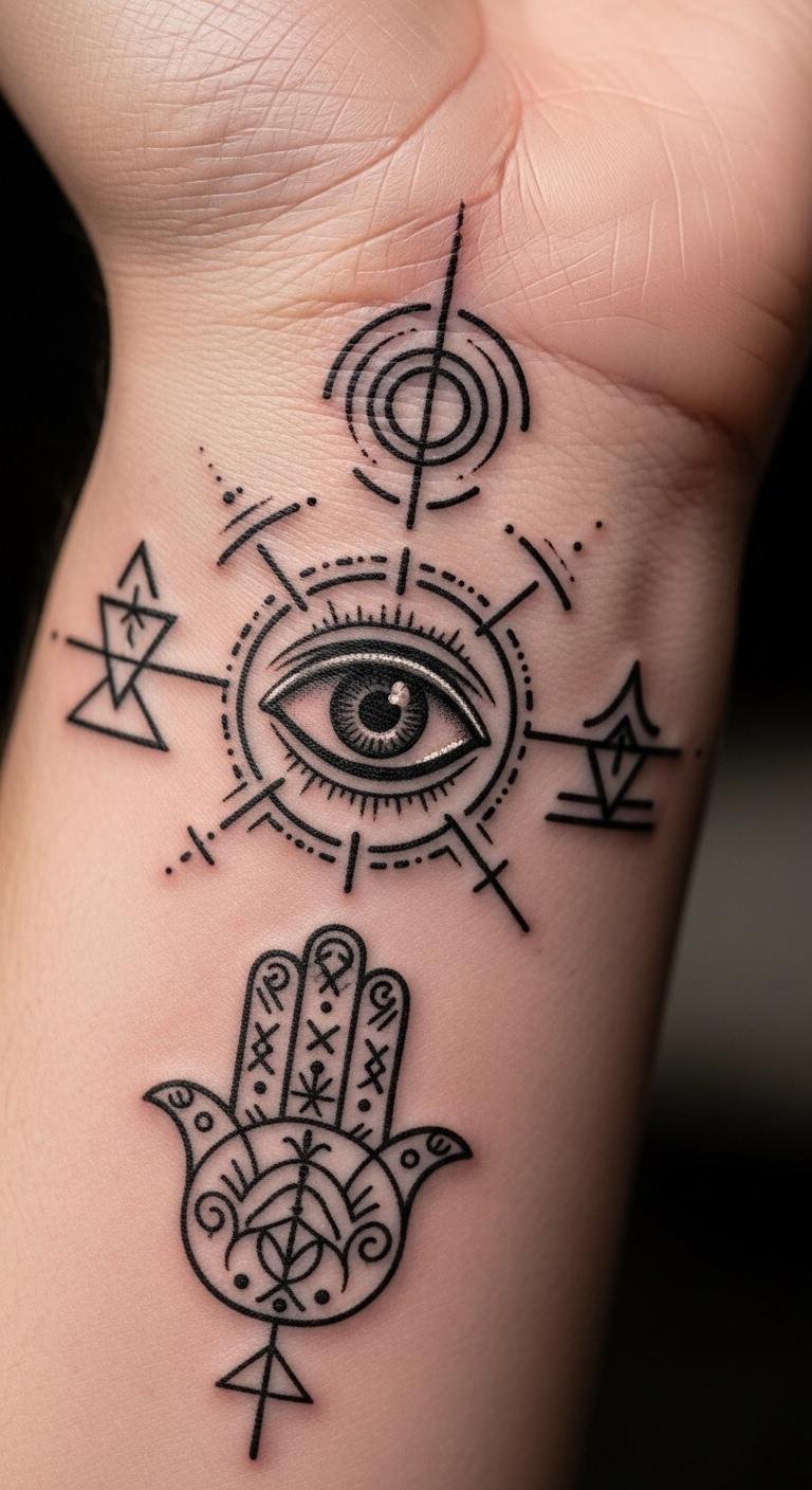 Amulet tattoos offer safety and luck. They guard like charms. Try it on your hand for wear. It shields your energy. Buy amulet transfers cheap. Draw symbols yourself. Look for protective deals. Opt for basic forms. Stay safe. This tattoo wards off harm.