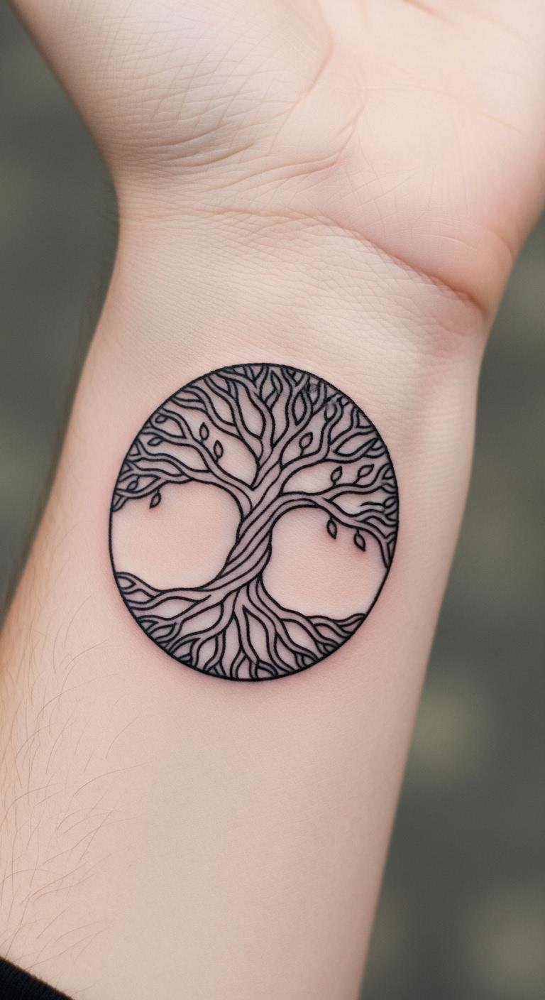Go for a geometric Tree of Life that plays with shapes for balance and growth. This style turns the tree into a modern puzzle of lines and angles, perfect for symbolizing life’s harmony. Place it on your shoulder where it’s easy to hide or show. Find an affordable artist online for under $200—check their portfolio first. Practice drawing triangles and circles at home to get ideas. Use free apps to mix your design with other elements. This approach lets you create something unique without big expenses. It’s a simple way to reflect personal renewal through clean, bold forms.