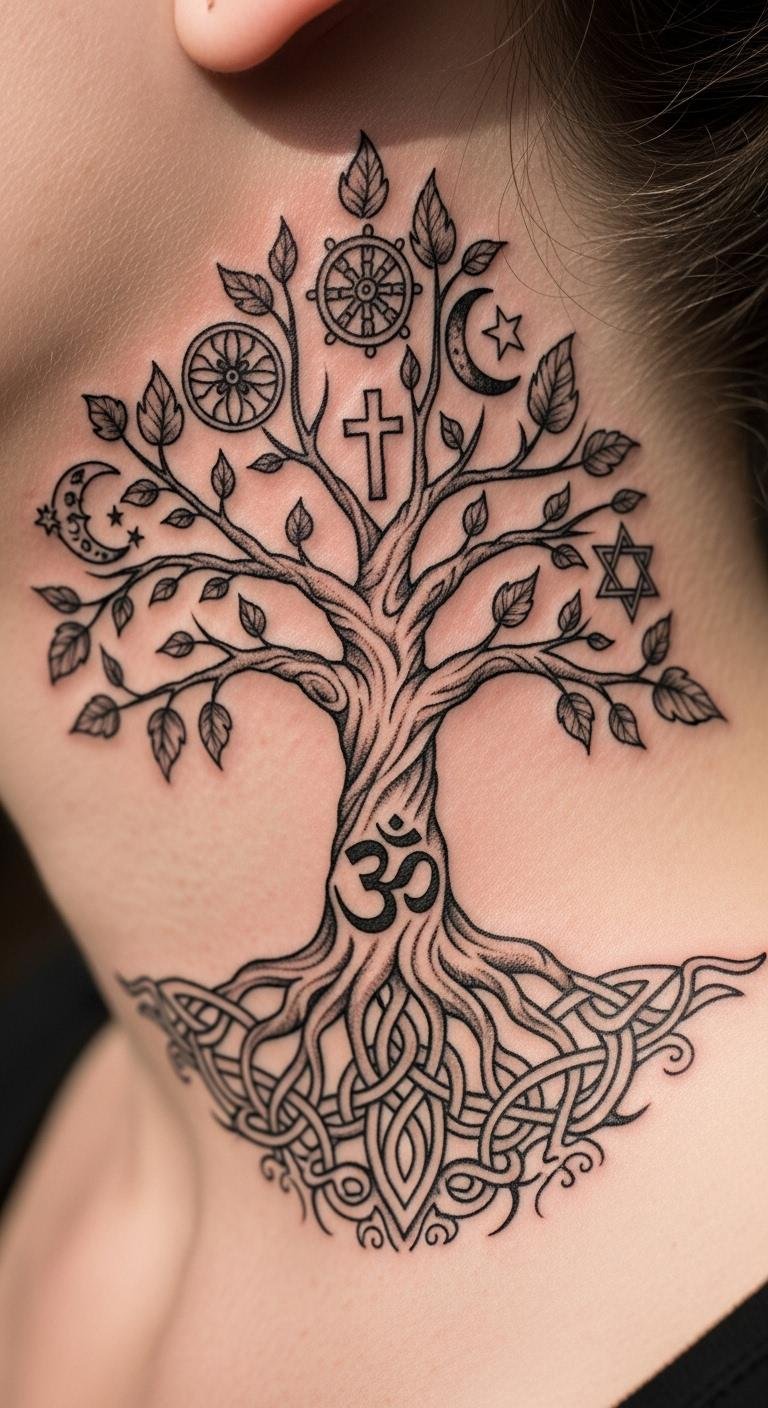 Choose a Religious Tree of Life that draws from faiths for inner peace and renewal. It might include crosses or stars for spiritual ties. Try your neck for a subtle placement. Seek artists at community events for $90 to $180. Sketch symbols on paper as a simple DIY. Mix in personal icons without extra cost. This idea supports spiritual growth affordably. Use it to find renewal through your beliefs.