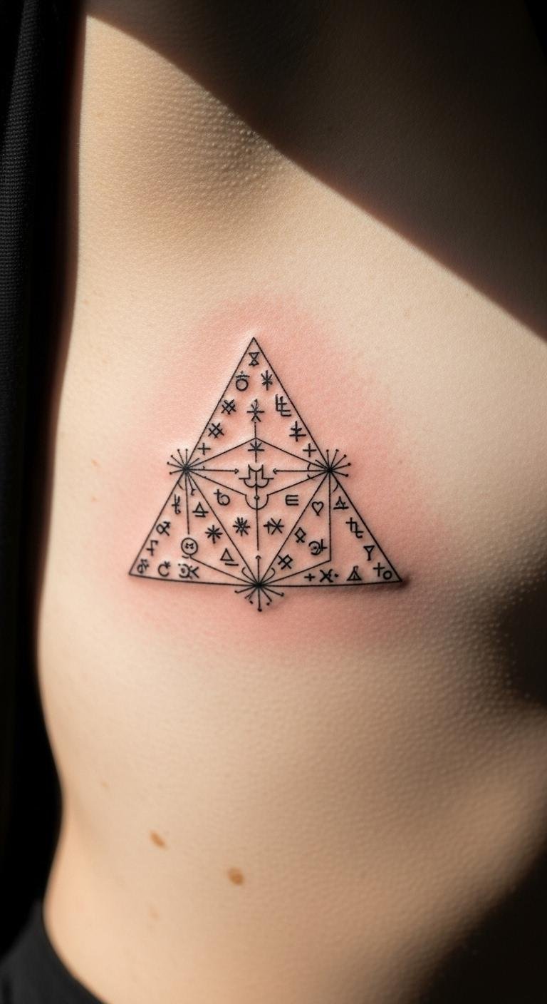 Personal triangles tell your story. They hold unique meanings. Jot down your experiences. Ask for custom work deals. Draw timelines at home. Rib areas keep it private. Tailor for your budget. This makes it special. Include dates or names. It’s a lifelong keepsake. Use journals to brainstorm. Rib tattoos heal privately. Make elements significant. You’ll cherish the tale. Notes apps help organize. This design speaks.