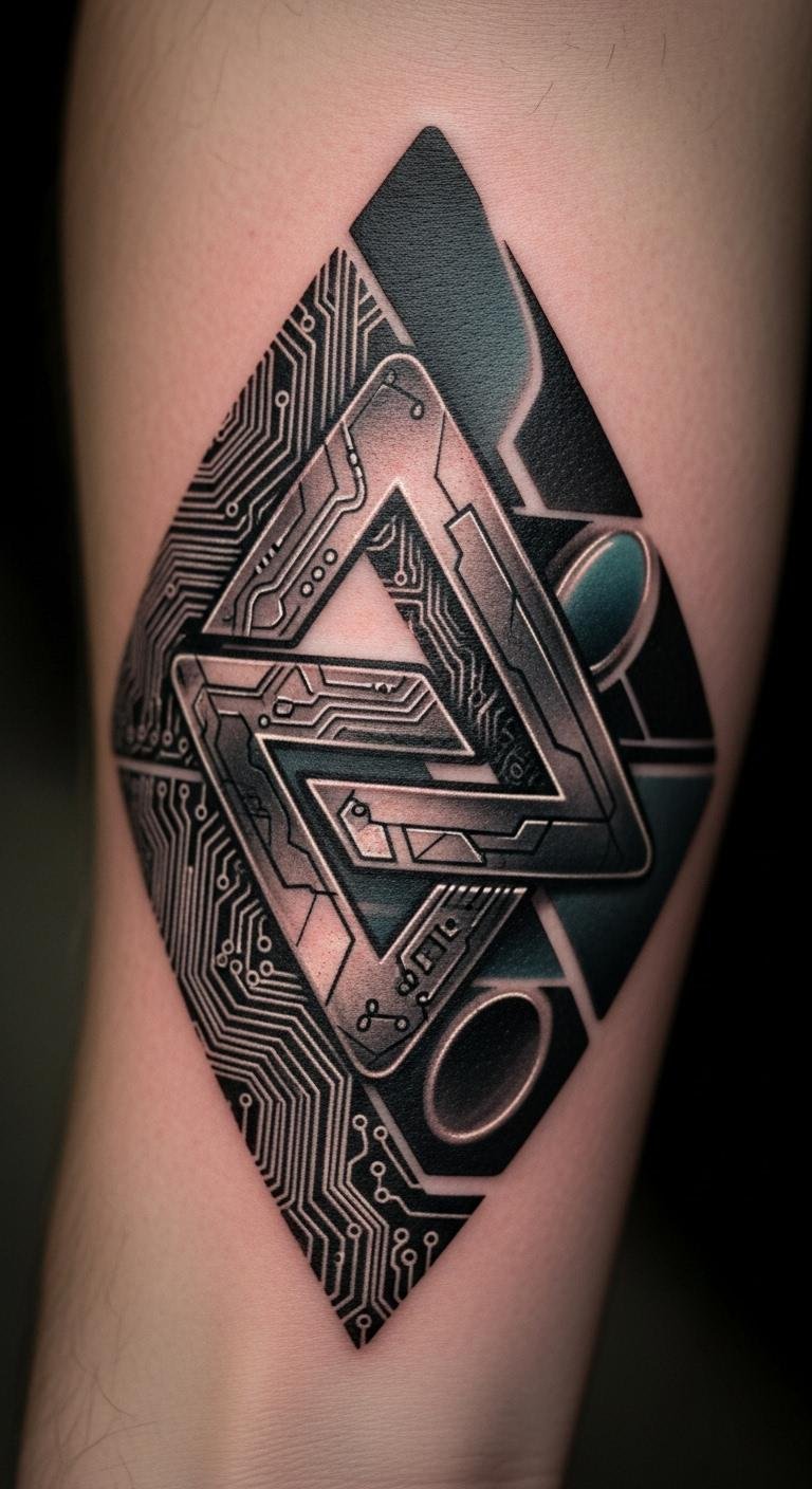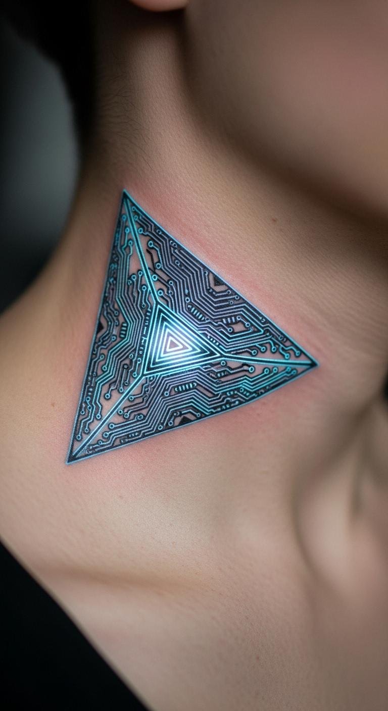 Tech triangles look forward. They use circuit designs. Code simple patterns. Search for tech-savvy artists. Build with circuit boards. Neck spots add edge. Go digital for savings. This fits innovators. Add pixels inside. It’s cutting-edge cool. Try with electronic drawings. Neck tattoos stand out. Make it gadget-like. You’ll embrace the future. Tech tools aid design. This idea innovates.