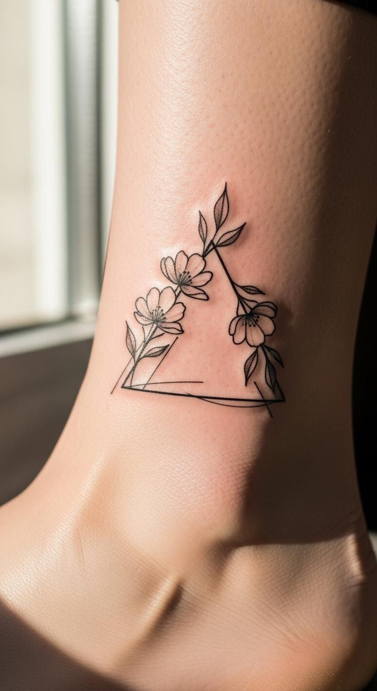 Mix a triangle with flowers for a nature vibe. It combines edges with soft petals. Draw ideas from your garden. Visit an affordable studio for quotes. Try flower pressing to preview at home. Put it on your ankle for subtlety. Go for fine lines to keep it light. This design costs less with basic ink. Add personal flowers like roses. It’s perfect for nature lovers. Use washable markers to test spots. Ankle tattoos hide under socks. Make it pop with shading. You’ll enjoy the fresh contrast. Free online templates help with planning. This idea adds charm to your day.