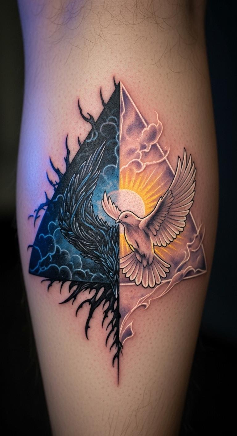 Duality triangles show opposites. They balance light and dark. Divide your ideas. Find theme experts affordably. Draw yin-yang styles. Leg areas tell stories. Keep halves equal. This explores contrasts. Add opposing colors. It’s insightful and deep. Use dual stickers. Leg tattoos evolve. Make it reflective. You’ll ponder it often. Themed apps assist. This idea balances.