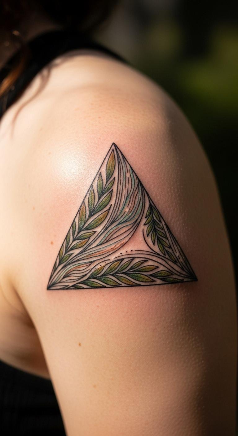 Triangles with nature feel alive. They incorporate leaves or trees. Collect outdoor samples. Find eco-friendly ink options. Sketch with natural dyes. Elbow spots are versatile. Keep additions simple for cost. This brings the outside in. Add vines for growth. It’s refreshing and real. Test with leaf rubbings. Elbow tattoos flex well. Make it seasonal. You’ll feel connected. Outdoor apps inspire. This idea grows.