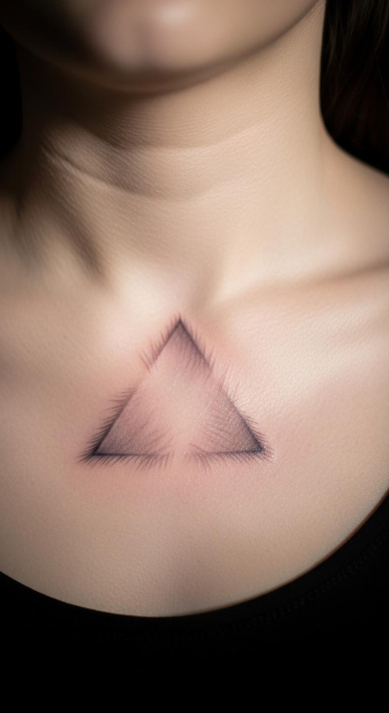 Soft triangles give a dreamy feel. They blend edges smoothly. Experiment with pastels. Look for deals on shading work. Use fabric paints for tests. Collarbone areas are discreet. Choose light ink for less cost. This suits creative minds. Add clouds around it. It’s gentle and flowing. Try with makeup sponges. Collarbone tattoos add grace. Make it fade-like. You’ll enjoy the whimsy. Video guides show techniques. This design floats lightly.